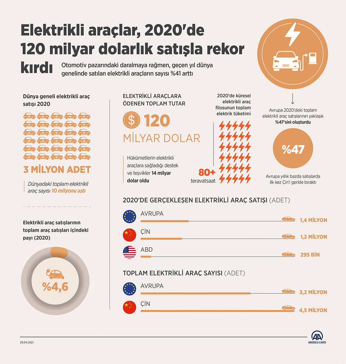 Dünyada satılan elektrikli araçların sayısı geçen yıl bir önceki yıla göre rekor (yüzde 41) artışla 3 milyon oldu. Tüketiciler elektrikli araçlara 2020'de bir önceki yıla göre yüzde 50 artışla 120 milyar dolar harcama yaptı.29 Nisan 2021•Güncelleme: 29 Nisan 2021