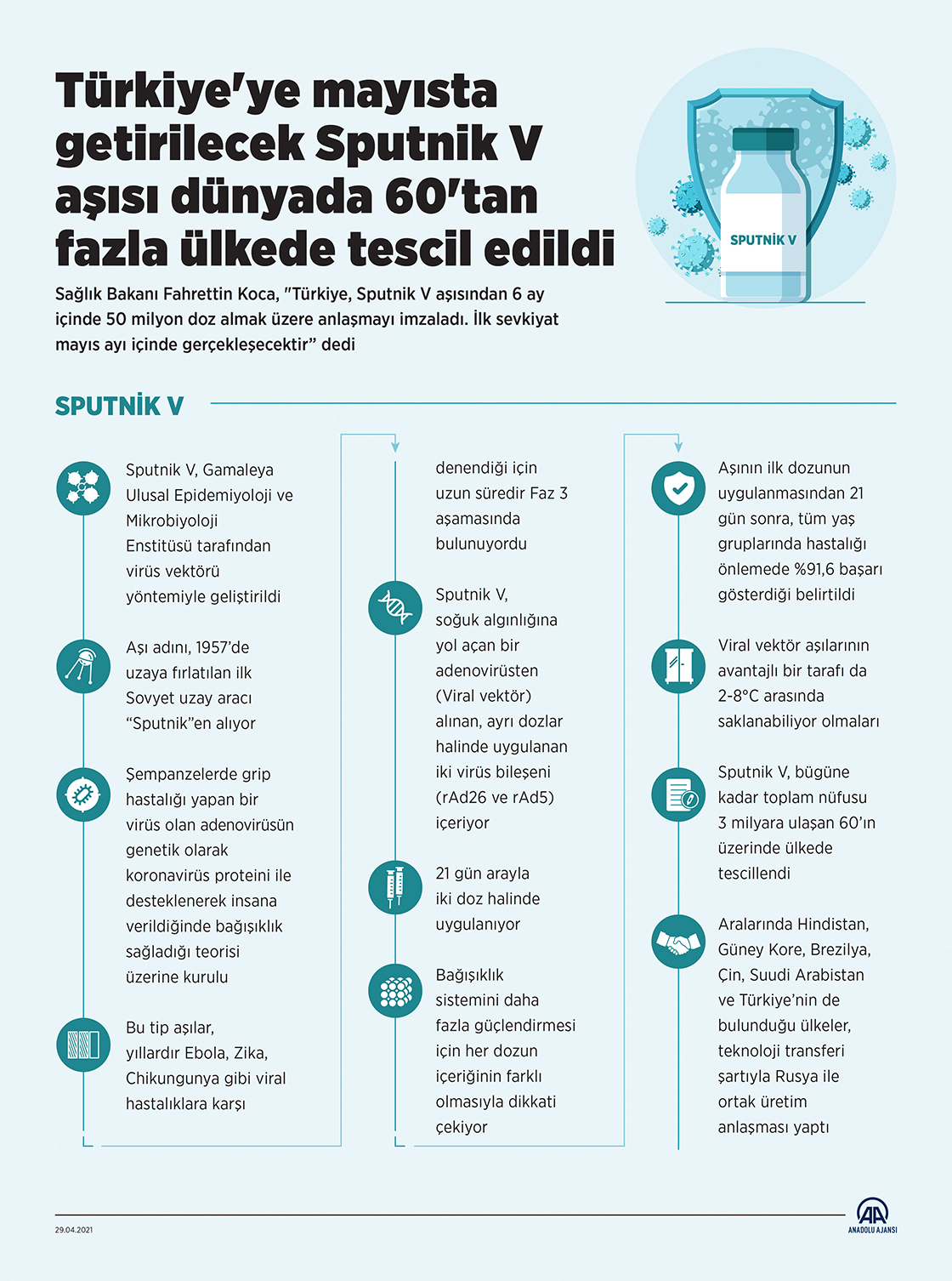 Türkiye'ye mayıs ayında getirilmesi beklenen, dünyada 60'tan fazla ülkenin tescil ettiği yeni tip koronavirüs (Kovid-19) aşısı Sputnik V, iki farklı doz ile antikor üretme yeteneğine sahip olmasıyla dikkati çekiyor.29 Nisan 2021•Güncelleme: 29 Nisan 2021