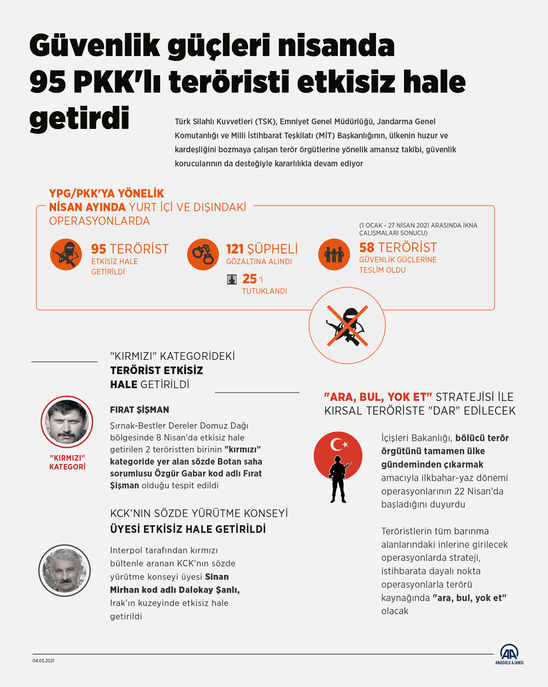 Türk Silahlı Kuvvetleri (TSK), Emniyet Genel Müdürlüğü, Jandarma Genel Komutanlığı ve Milli İstihbarat Teşkilatı (MİT) Başkanlığının, ülkenin huzur ve kardeşliğini bozmaya çalışan terör örgütlerine yönelik amansız takibi, güvenlik korucularının da desteğiyle kararlılıkla devam ediyor. (Grafik: Kemal Delikmen / AA)04 Mayıs 2021•Güncelleme: 04 Mayıs 2021