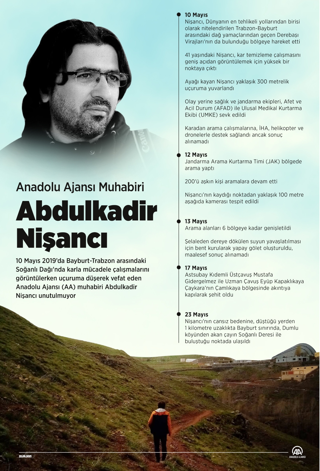 10 Mayıs 2019’da Bayburt-Trabzon arasındaki Soğanlı Dağı'nda karla mücadele çalışmalarını görüntülerken uçuruma düşerek vefat eden Anadolu Ajansı (AA) muhabiri Abdulkadir Nişancı unutulmuyor.