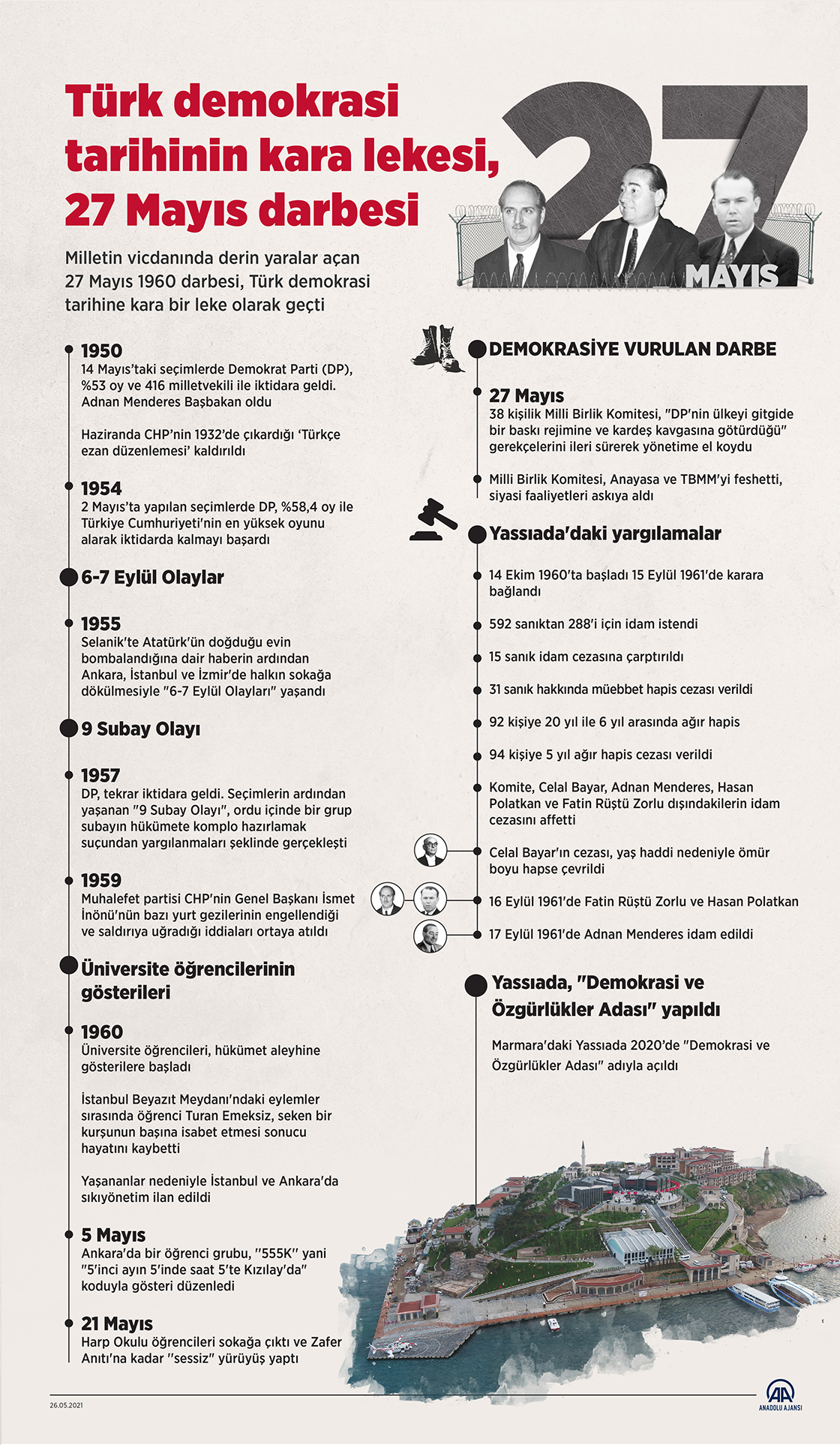 Türk demokrasi tarihinin kara lekelerinden biri olan ve milletin vicdanında derin yaralar açan 27 Mayıs 1960 darbesinin üzerinden 61 yıl geçti. (Grafik: Omar Zaghloul/AA)