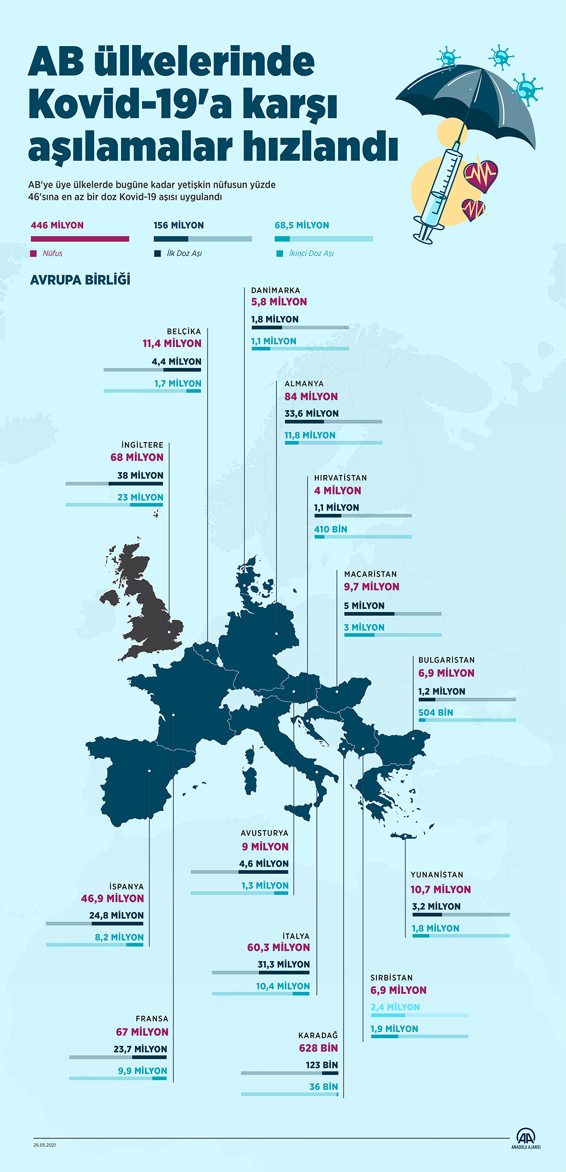 AB'ye üye ülkelerde bugüne kadar yetişkin nüfusun yüzde 46'sına en az bir doz Kovid-19 aşısı uygulandı. (Grafik: Mahmut Resul Karaca/AA)