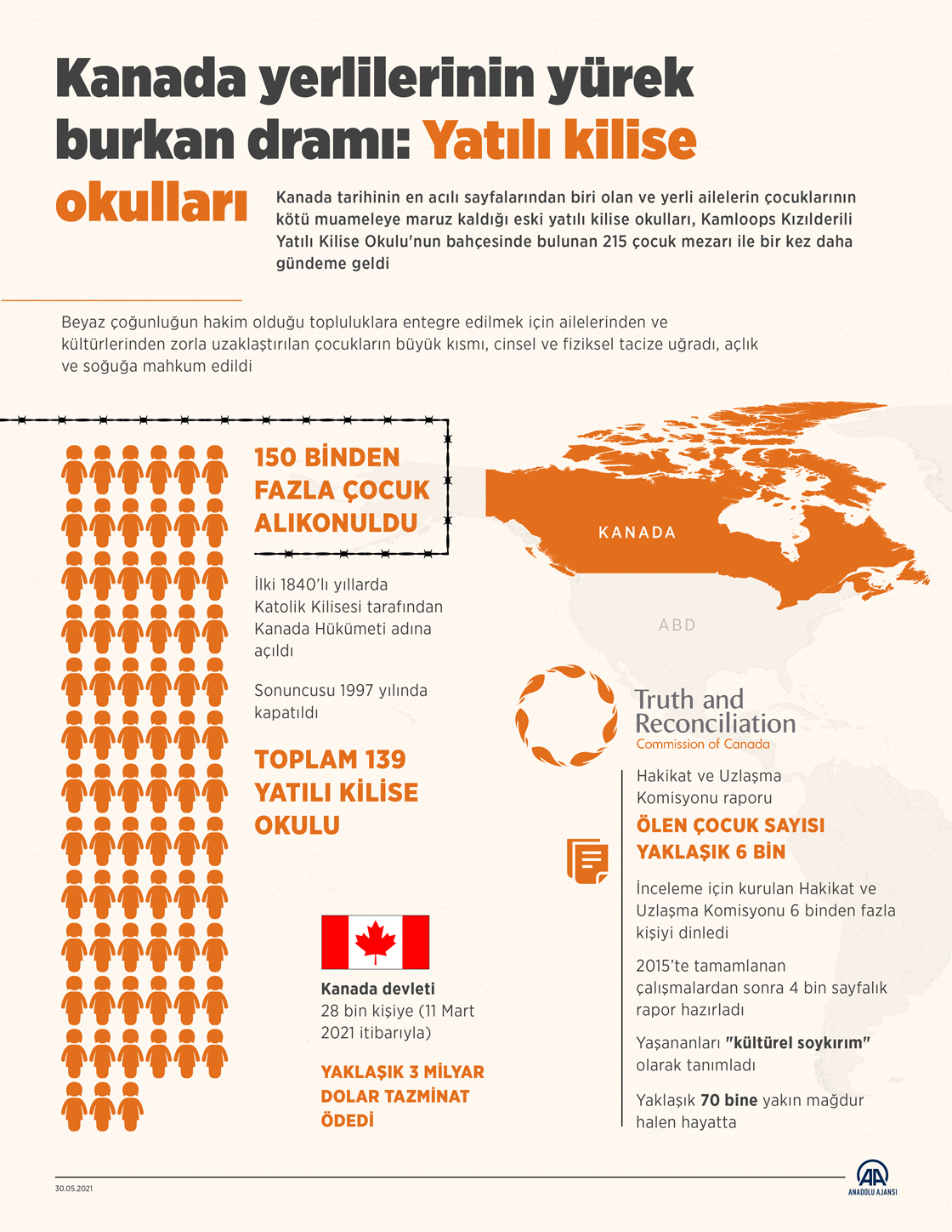 Kanada tarihinin en acılı sayfalarından biri olan ve yerli ailelerin çocuklarının kötü muameleye maruz kaldığı eski yatılı kilise okulları, Kamloops Kızılderili Yatılı Kilise Okulu'nun bahçesinde bulunan 215 çocuk mezarı ile bir kez daha gündeme geldi. ( Yasin Demirci - Anadolu Ajansı )30 Mayıs 2021•Güncelleme: 30 Mayıs 2021