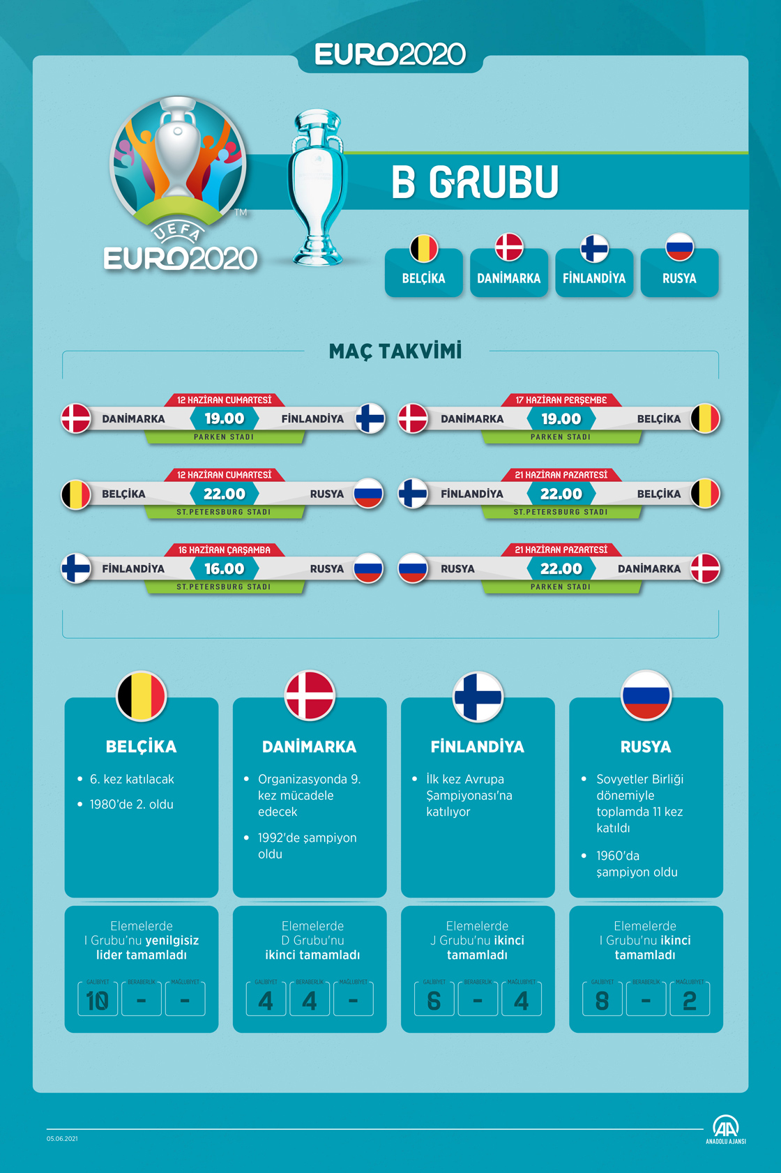 16. Avrupa Futbol Şampiyonası'nın (EURO 2020) B Grubu'nda Belçika, Danimarka, Finlandiya ve Rusya mücadele edecek. (Grafik: Kemal Delikmen / AA)