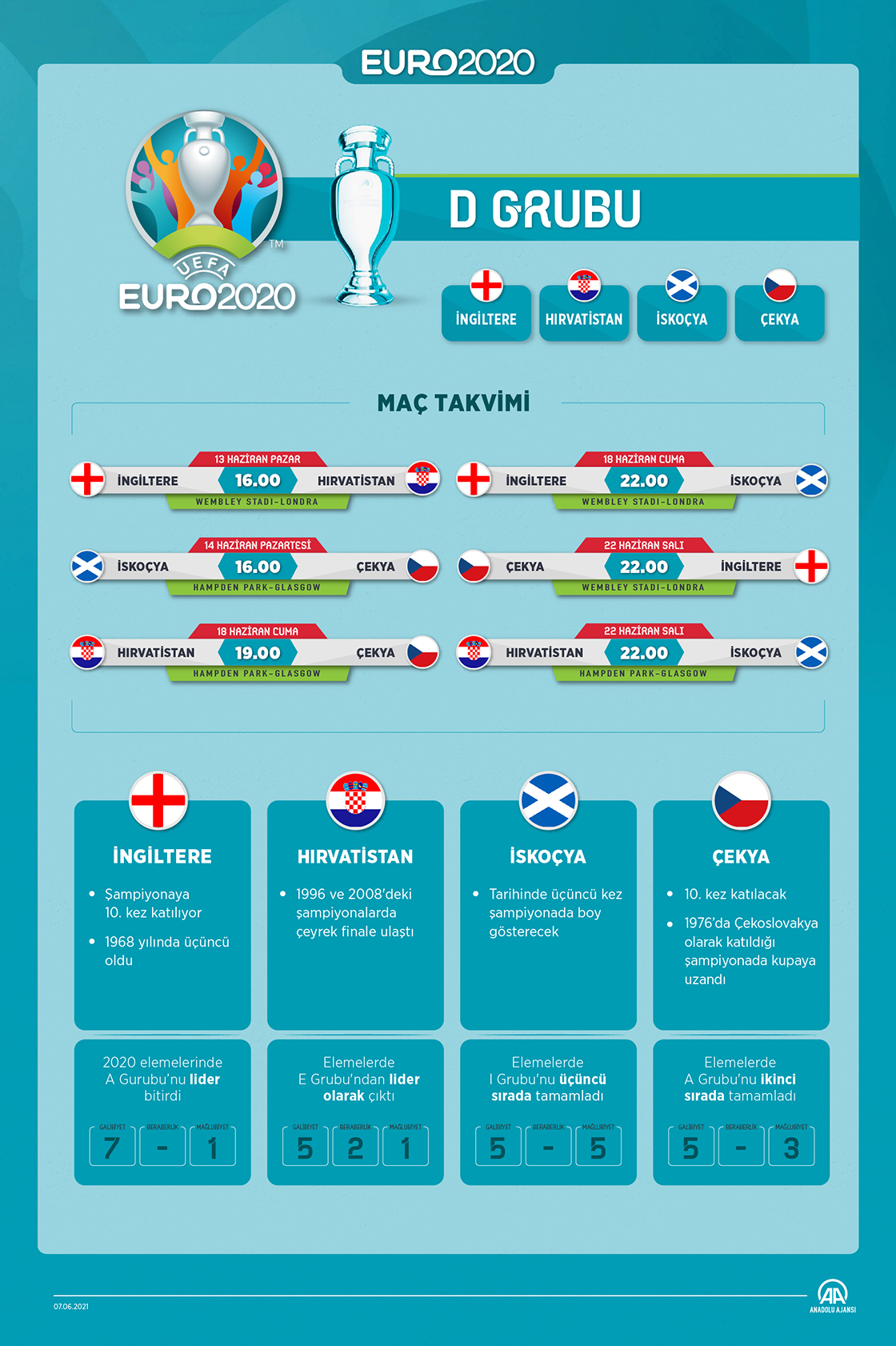 16. Avrupa Futbol Şampiyonası'nın (EURO 2020) D Grubu'nda İngiltere, Hırvatistan, İskoçya ve Çekya mücadele edecek. (Grafik: Kemal Delikmen/AA)
