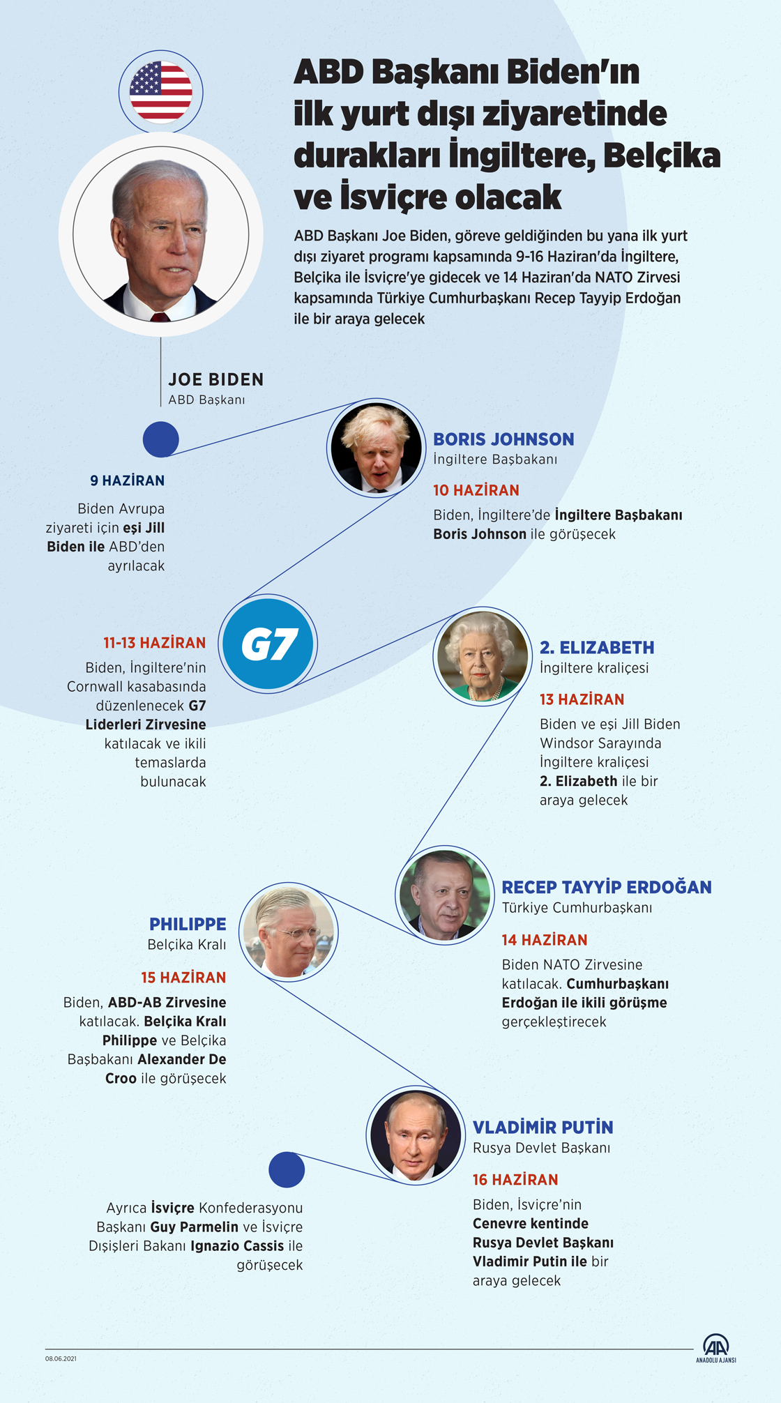 ABD Başkanı Joe Biden, göreve geldiğinden bu yana ilk yurt dışı ziyaret programı kapsamında 9-16 Haziran'da İngiltere, Belçika ile İsviçre'ye gidecek ve 14 Haziran'da NATO Zirvesi kapsamında Türkiye Cumhurbaşkanı Recep Tayyip Erdoğan ile bir araya gelecek. ( Elmurod Usubaliev - Anadolu Ajansı )08 Haziran 2021•Güncelleme: 08 Haziran 2021