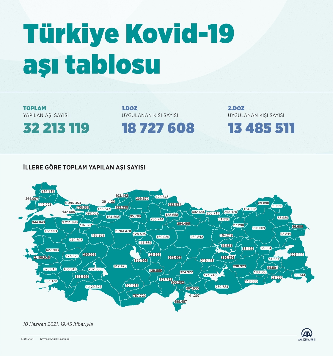 Türkiye'de bugüne kadar 32 milyon 213 bin 119 doz Kovid-19 aşısı yapıldı. 18 milyon 727 bin 608 kişiye ilk doz, 13 milyon 485 bin 511 kişiye de ikinci doz aşılar uygulandı.