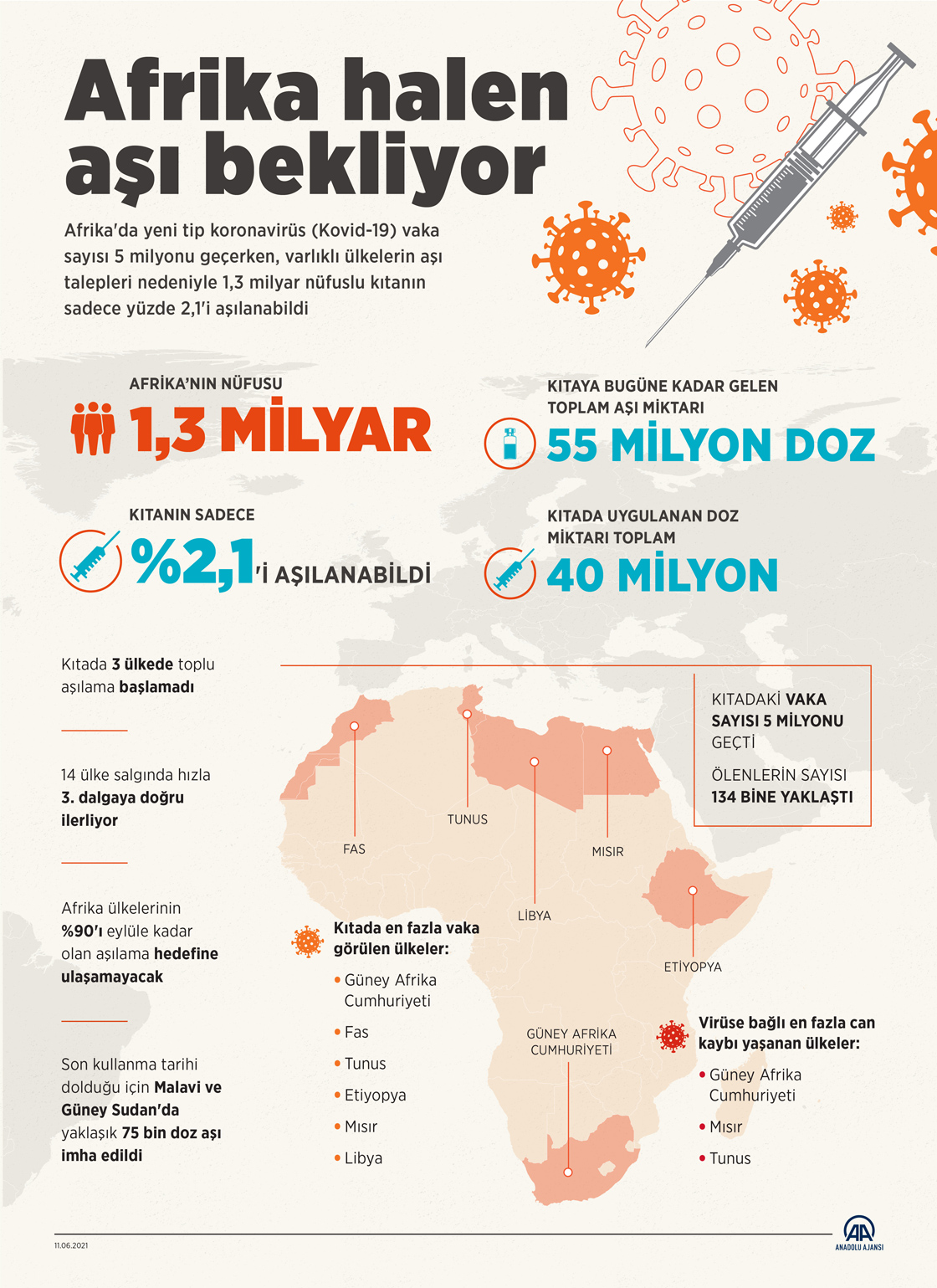 Afrika'da yeni tip koronavirüs (Kovid-19) vakası sayısı 5 milyonu geçerken, varlıklı ülkelerin aşı talepleri nedeniyle 1,3 milyar nüfuslu kıtanın sadece yüzde 2,1'i aşılanabildi. (Grafik: Elmurod Usubaliev / AA)