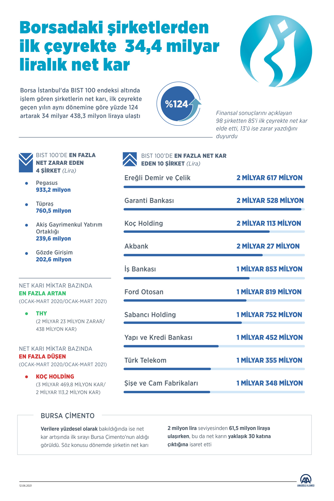 Borsa İstanbul'da BIST 100 endeksi altında işlem gören şirketlerin net karı, ilk çeyrekte geçen yılın aynı dönemine göre yüzde 124 artarak 34 milyar 438,3 milyon liraya ulaştı. ( Yılmaz Yücel - Anadolu Ajansı )