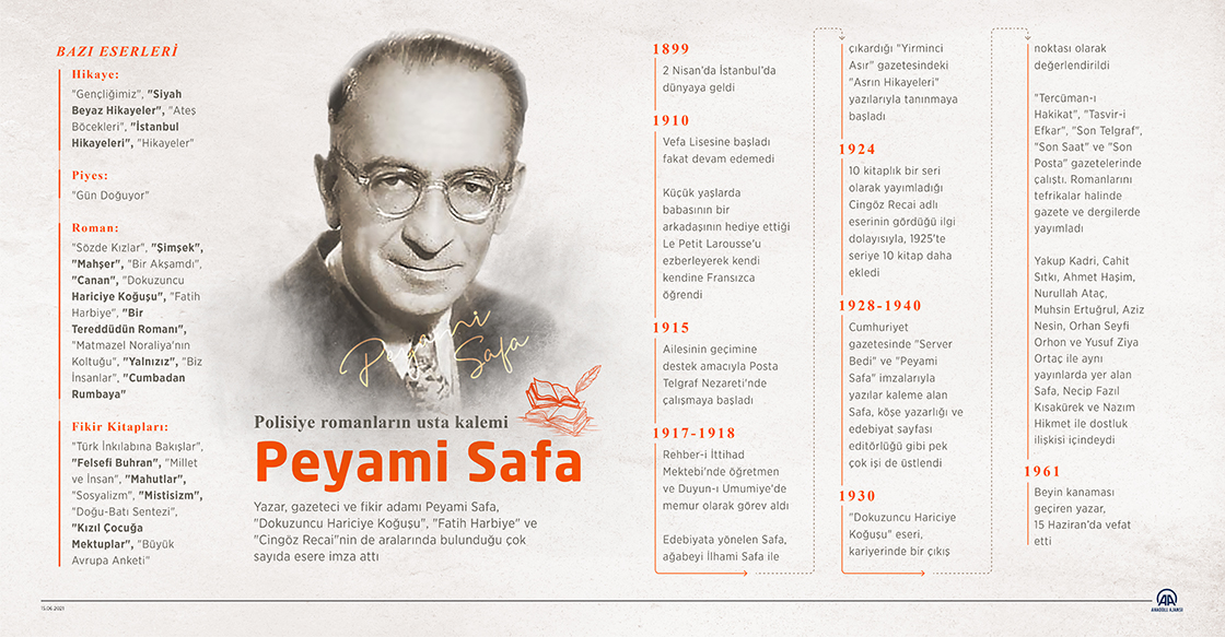 Yazar, gazeteci ve fikir adamı Peyami Safa, "Dokuzuncu Hariciye Koğuşu", "Fatih Harbiye" ve "Cingöz Recai"nin de aralarında bulunduğu çok sayıda esere imza attı. (Grafik: Muhammed Ali Yiğit/AA)