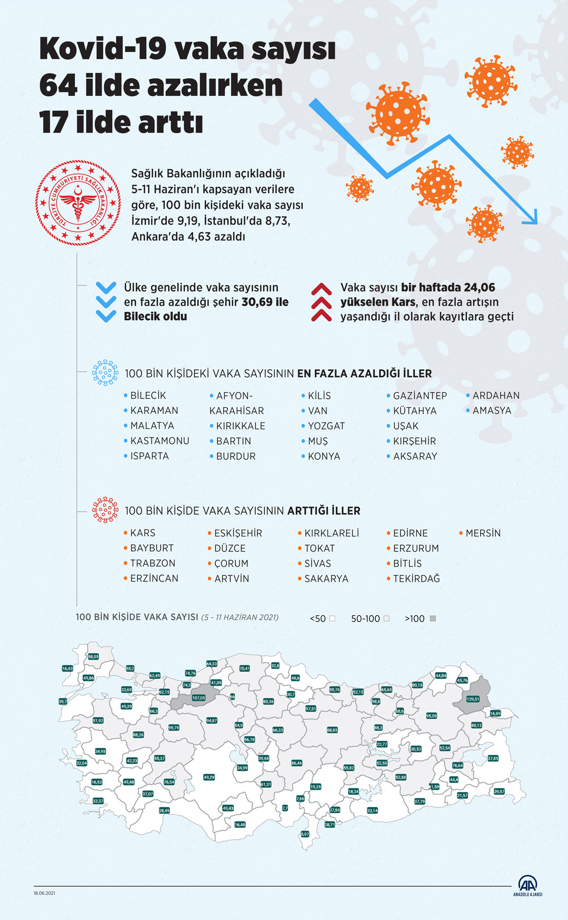 Sağlık Bakanlığının açıkladığı 5-11 Haziran'ı kapsayan verilere göre, 100 bin kişideki vaka sayısı İzmir'de 9,19, İstanbul'da 8,73, Ankara'da 4,63 azaldı. (Grafik: Mahmut Resul Karaca / AA)
