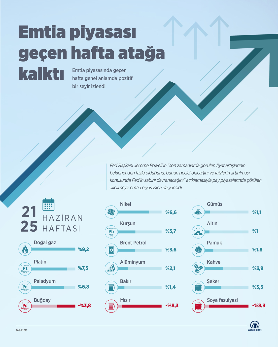 Emtia piyasası geçen hafta ABD Merkez Bankası'ndan (Fed) gelen "güvercin" açıklamalar, dolar ve tahvil faizlerindeki geri çekilmelerle atağa kalktı.(Grafik:Muhammed Ali Yiğit/AA)