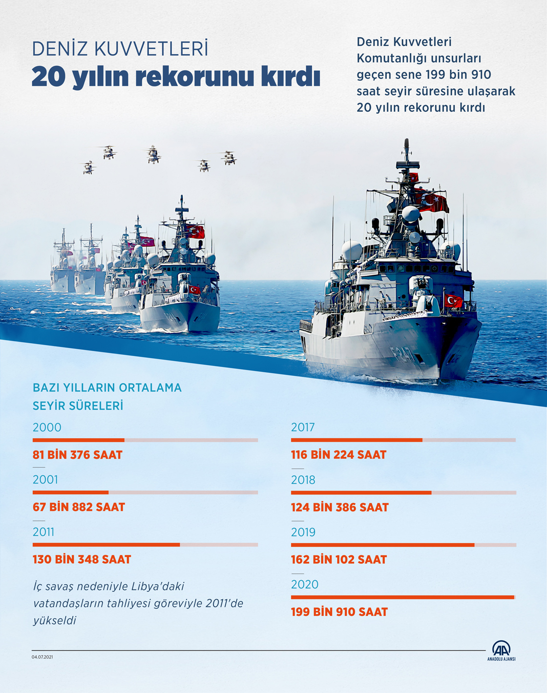 Gerek Mavi Vatan'daki gerekse diğer milli, uluslararası ve NATO görevlerini aynı anda yerine getiren Deniz Kuvvetleri Komutanlığı unsurları geçen sene 199 bin 910 saat seyir süresine ulaşarak 20 yılın rekorunu kırdı. ( Muhammed Ali Yiğit - Anadolu Ajansı )04 Temmuz 2021•Güncelleme: 04 Temmuz 2021