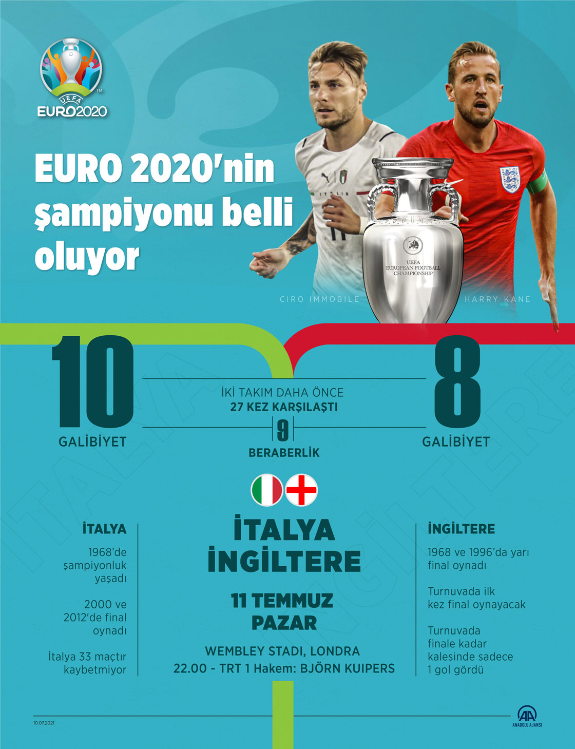 2020 Avrupa Futbol Şampiyonası (EURO 2020) finalinde yarın İtalya ile İngiltere karşılaşacak. İngiltere'nin başkenti Londra'daki Wembley Stadı'nda TSİ 22.00'de başlayacak final maçı, TRT 1'den naklen yayımlanacak. ( Yasin Demirci - Anadolu Ajansı )