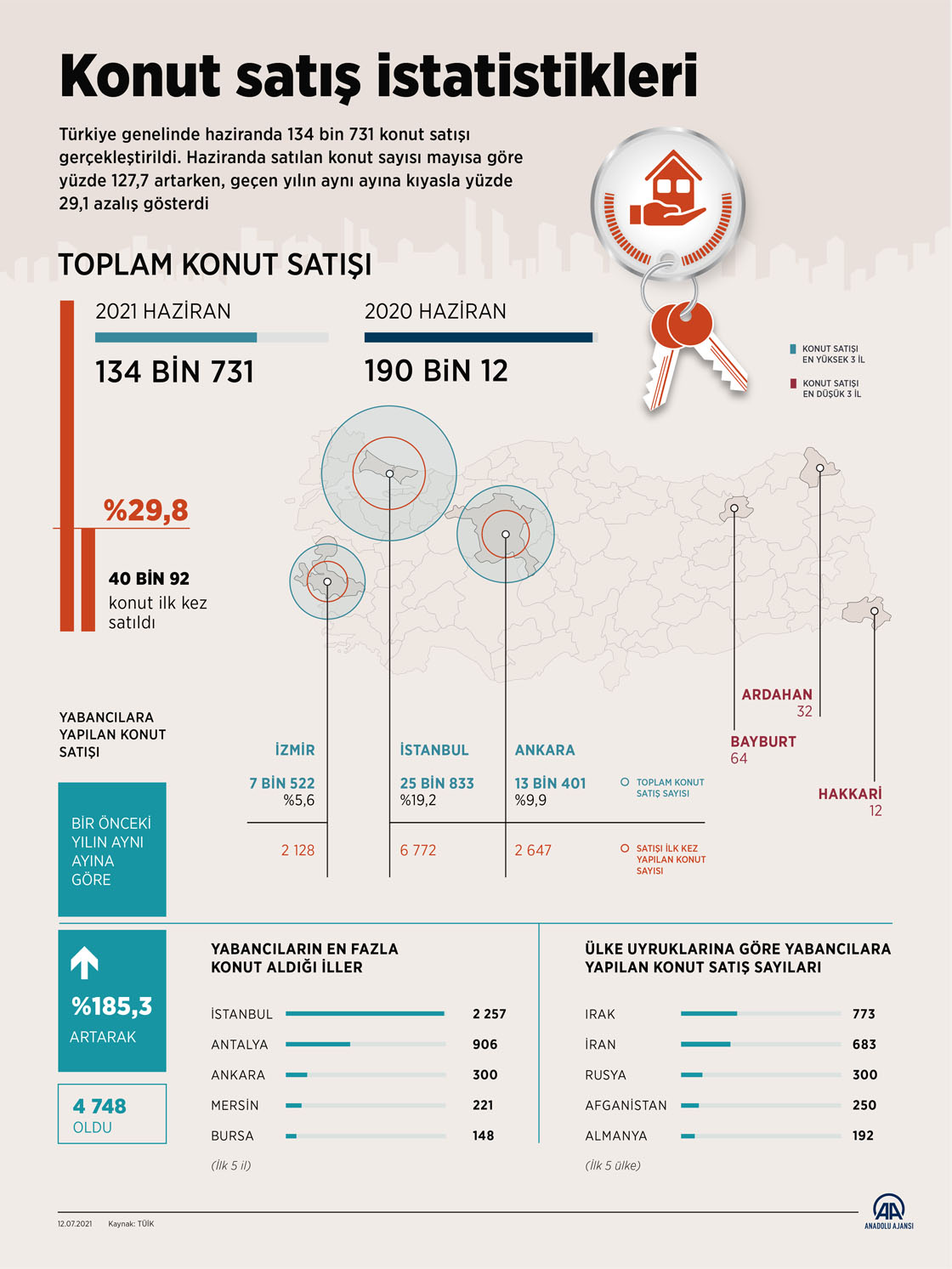 Türkiye genelinde haziranda 134 bin 731 konut satışı gerçekleştirildi. Haziranda satılan konut sayısı mayısa göre yüzde 127,7 artarken, geçen yılın aynı ayına kıyasla yüzde 29,1 azalış gösterdi. ( Muhammed Ali Yiğit - Anadolu Ajansı )