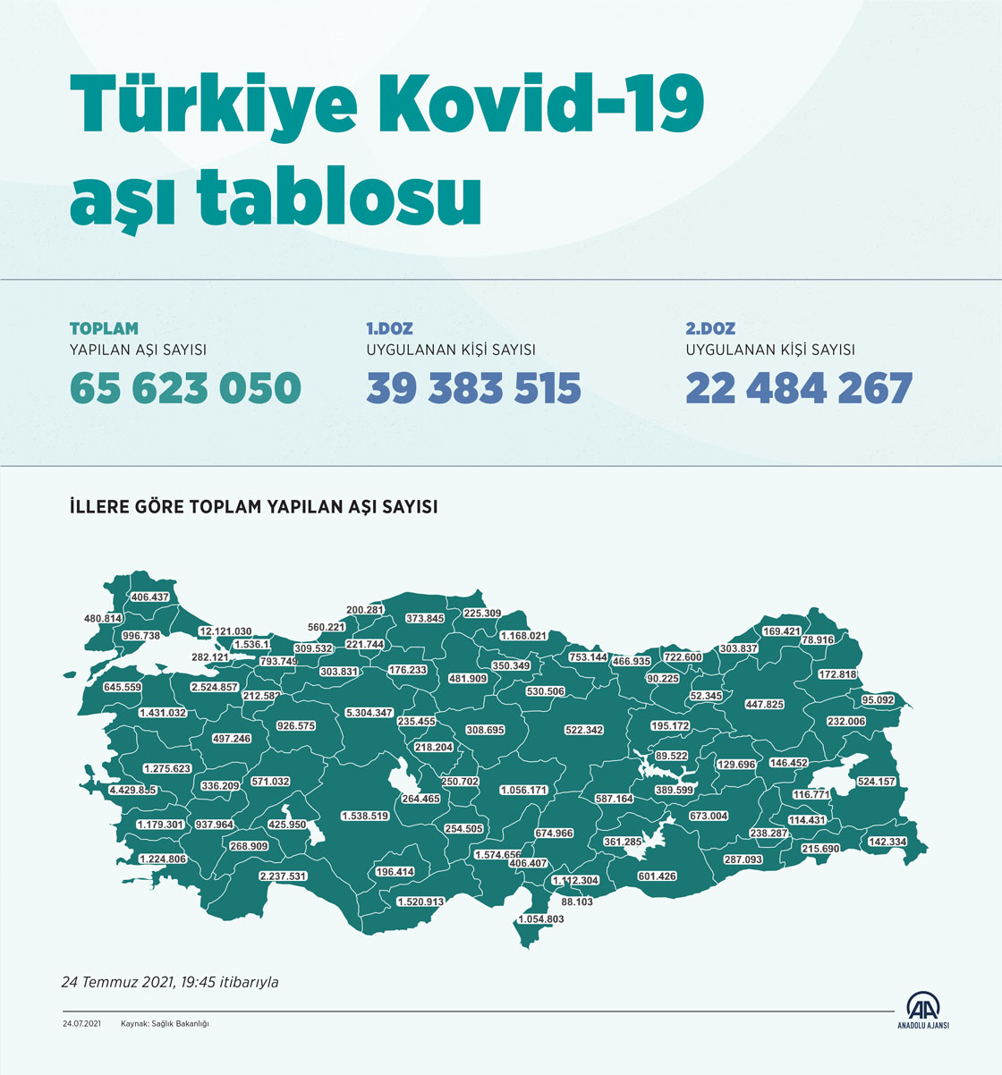 Türkiye'de bugüne kadar 65 milyon 632 bin 50 doz Kovid-19 aşısı yapıldı. 39 milyon 383 bin 515 kişiye ilk doz, 22 milyon 484 bin 267 kişiye de ikinci doz aşılar uygulandı. ( Omar Zaghloul - Anadolu Ajansı )