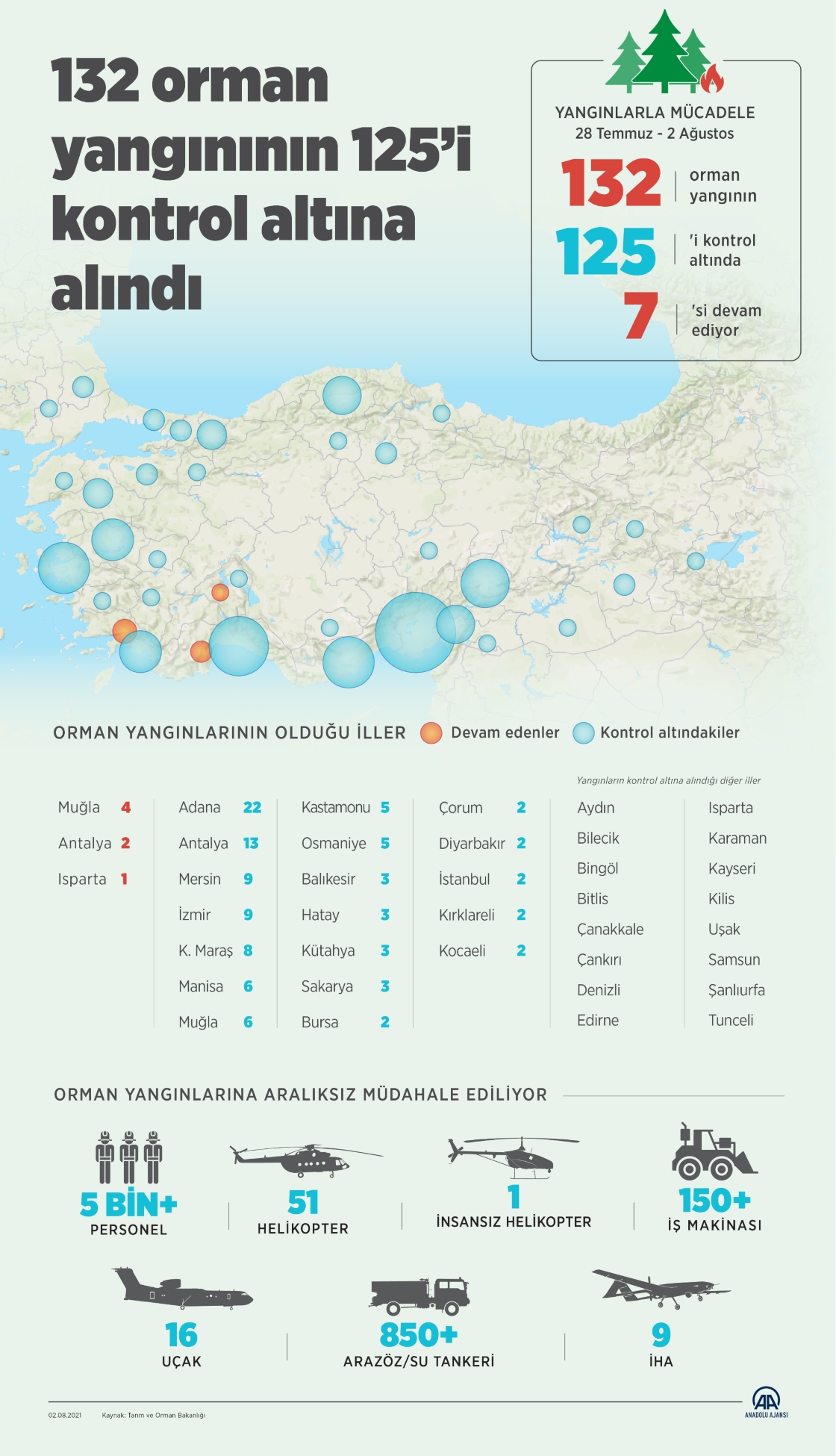Türkiye genelinde 28 Temmuz-2 Ağustos tarihlerinde 36 ilde çıkan 132 yangından 125'i, havadan ve karadan etkili müdahalelerle kontrol altına alındı.