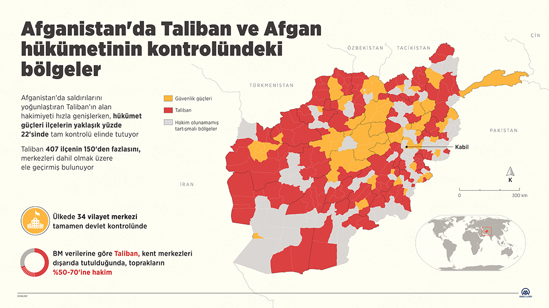Afganistan'da saldırılarını yoğunlaştıran Taliban'ın alan hakimiyeti hızla genişlerken, hükümet güçleri ilçelerin yaklaşık yüzde 22'sinde tam kontrolü elinde tutuyor. (Grafik: Elmurod Usubaliev/AA)
