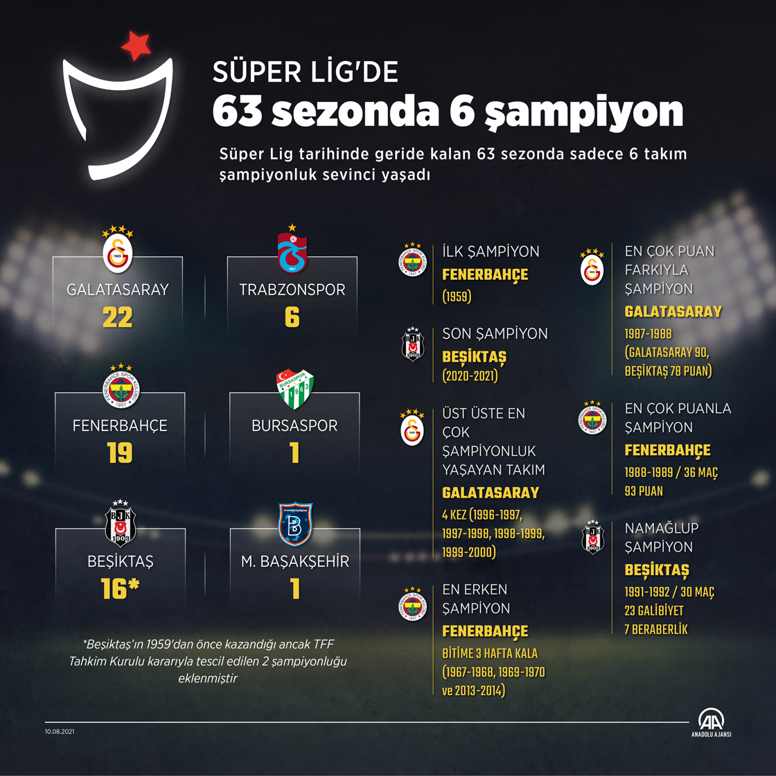 Eski adıyla Türkiye 1. Futbol Ligi, son yıllardaki adıyla Süper Lig'de geride kalan 63 sezonda şampiyonlukları 6 takım paylaştı. (Grafik: Muhammed Ali Yiğit / AA)