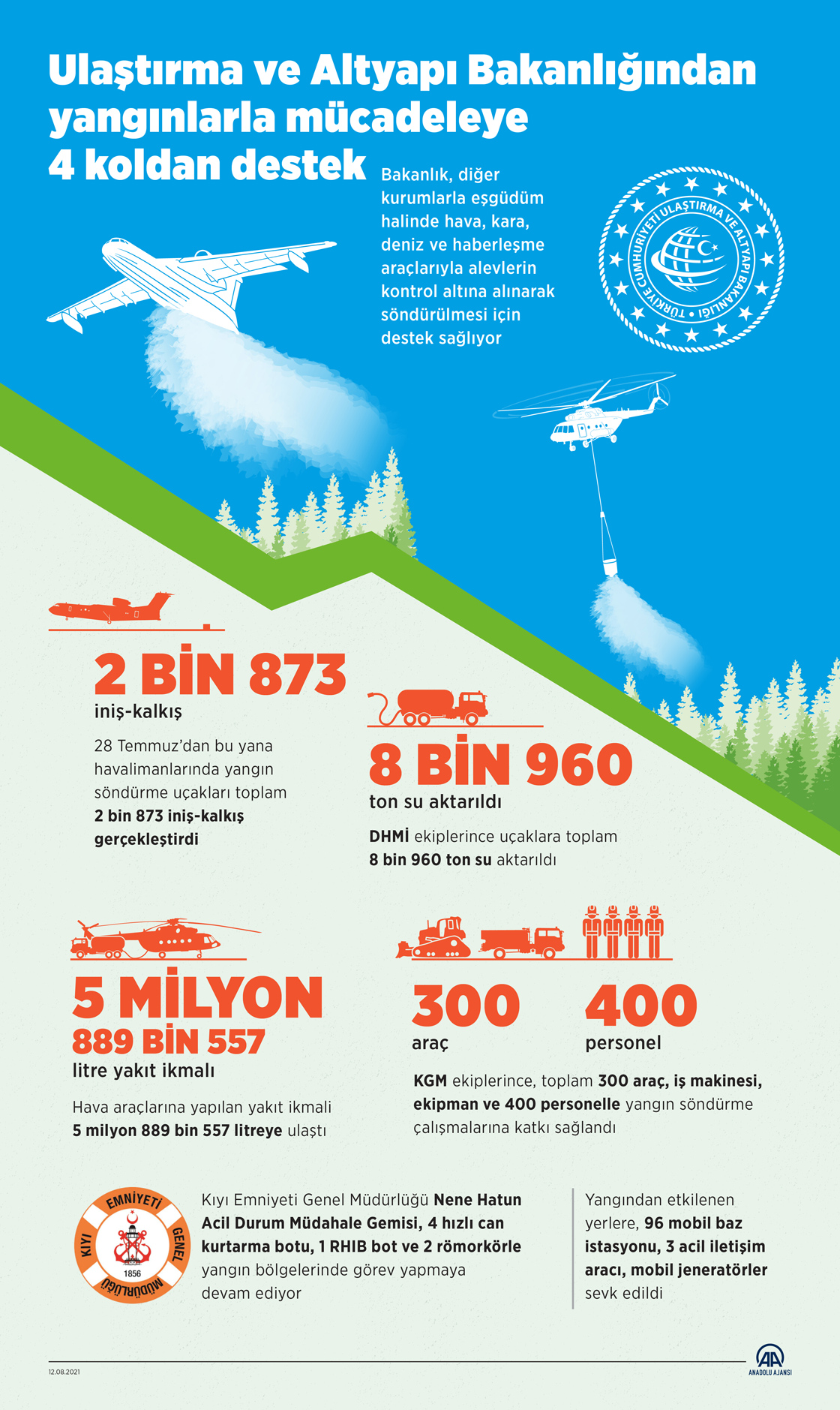 Türkiye, kurumları, sivil toplum kuruluşları, bölgede yaşayan vatandaşlarıyla tarihinin en büyük orman yangınlarına karşı topyekun mücadele ederken Ulaştırma ve Altyapı Bakanlığına bağlı ekipler de kara, deniz, hava, haberleşme araçları ve altyapı yönetimiyle bu mücadeleye destek sağlıyor.(Grafik: Elmurod Usubaliev/AA)