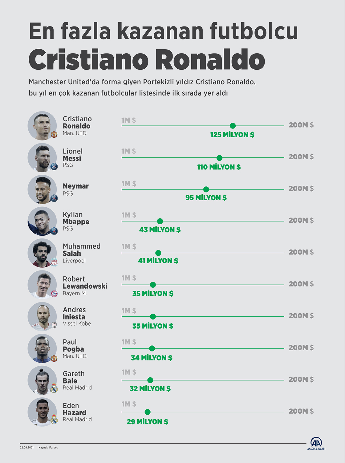 Manchester United'da forma giyen Portekizli yıldız Cristiano Ronaldo, bu yıl en çok kazanan futbolcular listesinde ilk sırada yer aldı. (Grafik: Mahmut Resul Karaca/AA)