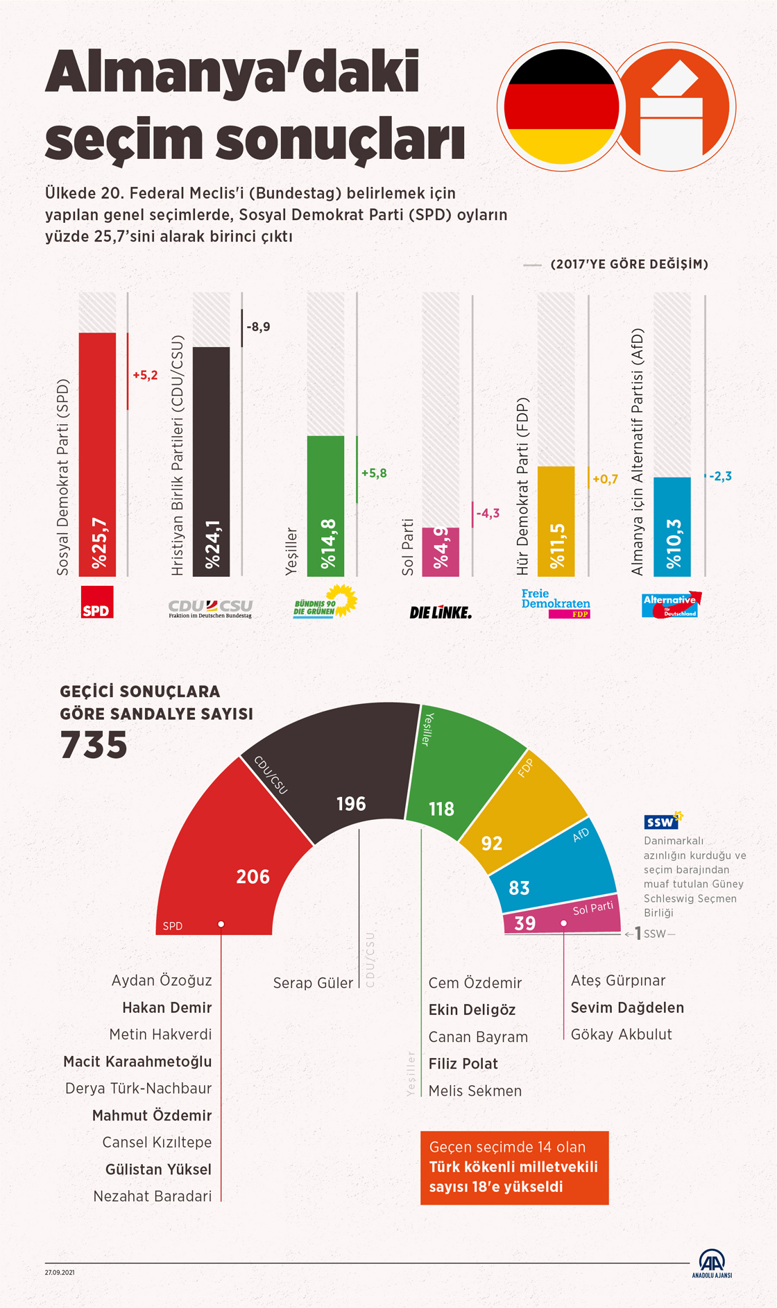 Ülkede 20. Federal Meclis'i (Bundestag) belirlemek için yapılan genel seçimlerde, Sosyal Demokrat Parti (SPD) oyların yüzde 25,7’sini alarak birinci çıktı. (Grafik: Yasin Demirci / AA)