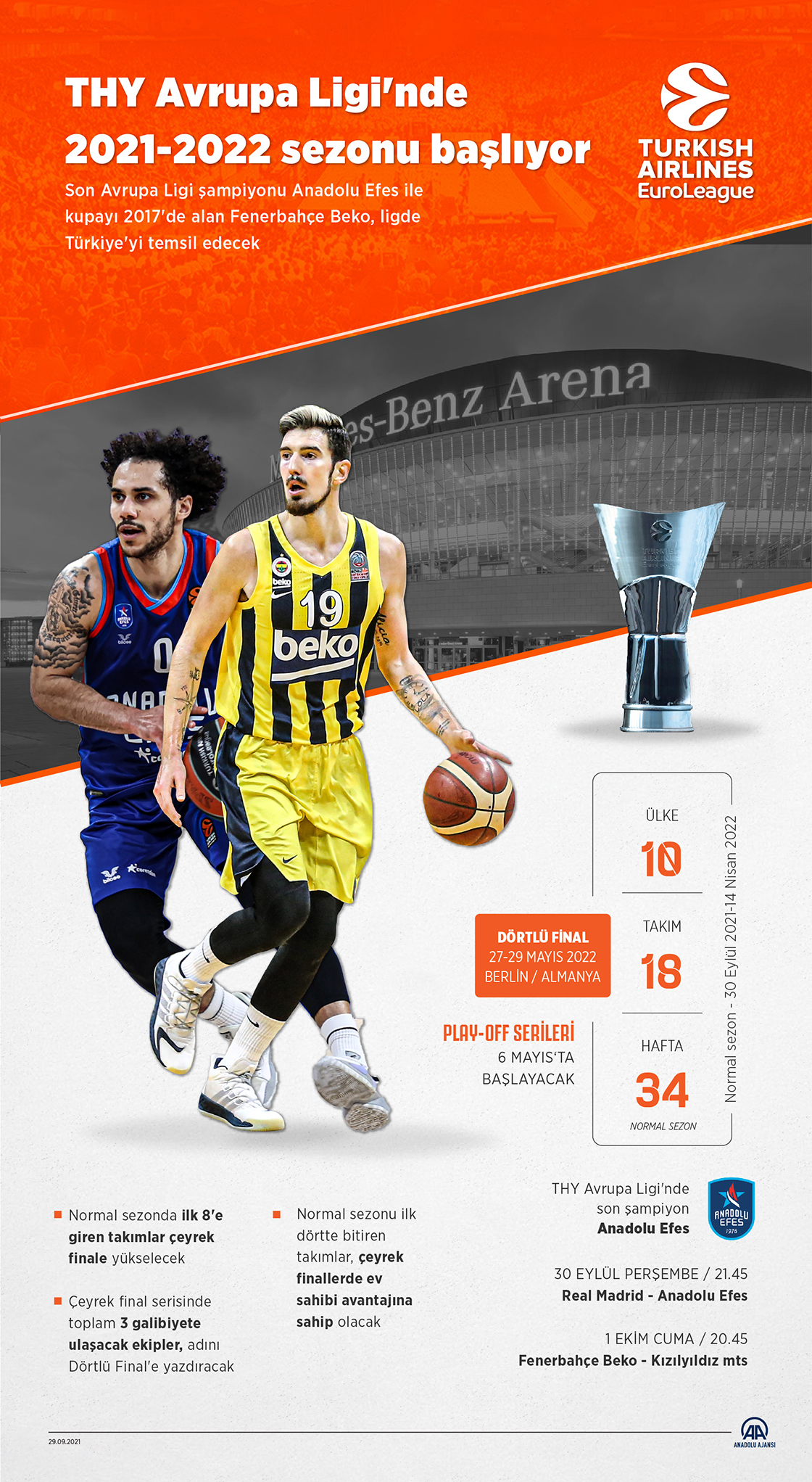 Son Avrupa Ligi şampiyonu Anadolu Efes ile kupayı 2017'de alan Fenerbahçe Beko, ligde Türkiye'yi temsil edecek. (Grafik: Kemal Delikmen/AA)