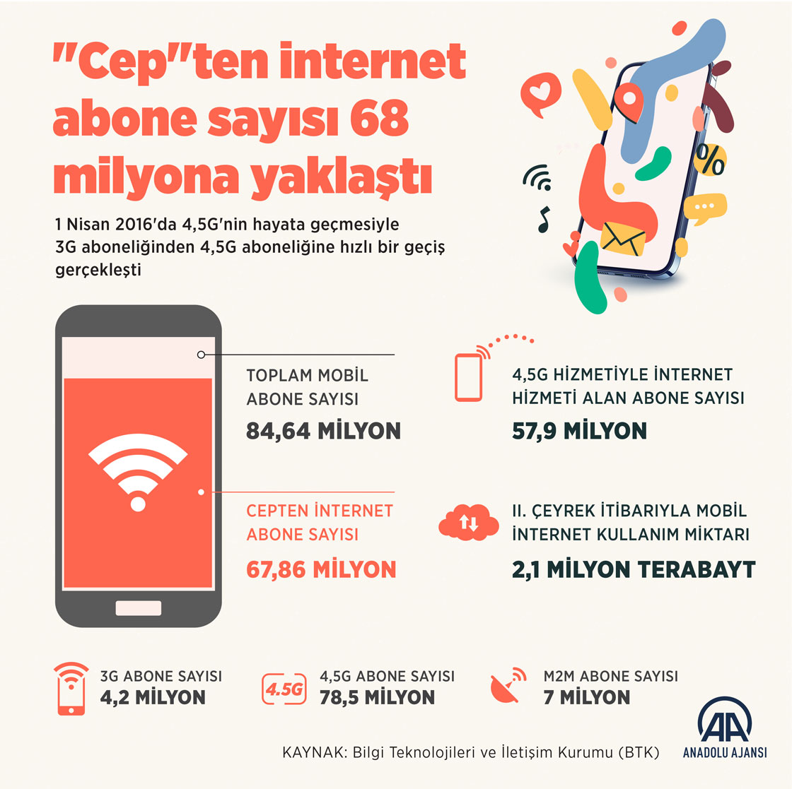 Türkiye'de 3G ve 4,5G hizmetiyle mobil bilgisayardan ve cepten internet hizmeti alan mobil geniş bant abone sayısı 67 milyon 857 bin 214'e ulaştı. (Grafik: Mahmut Resul Karaca / AA)