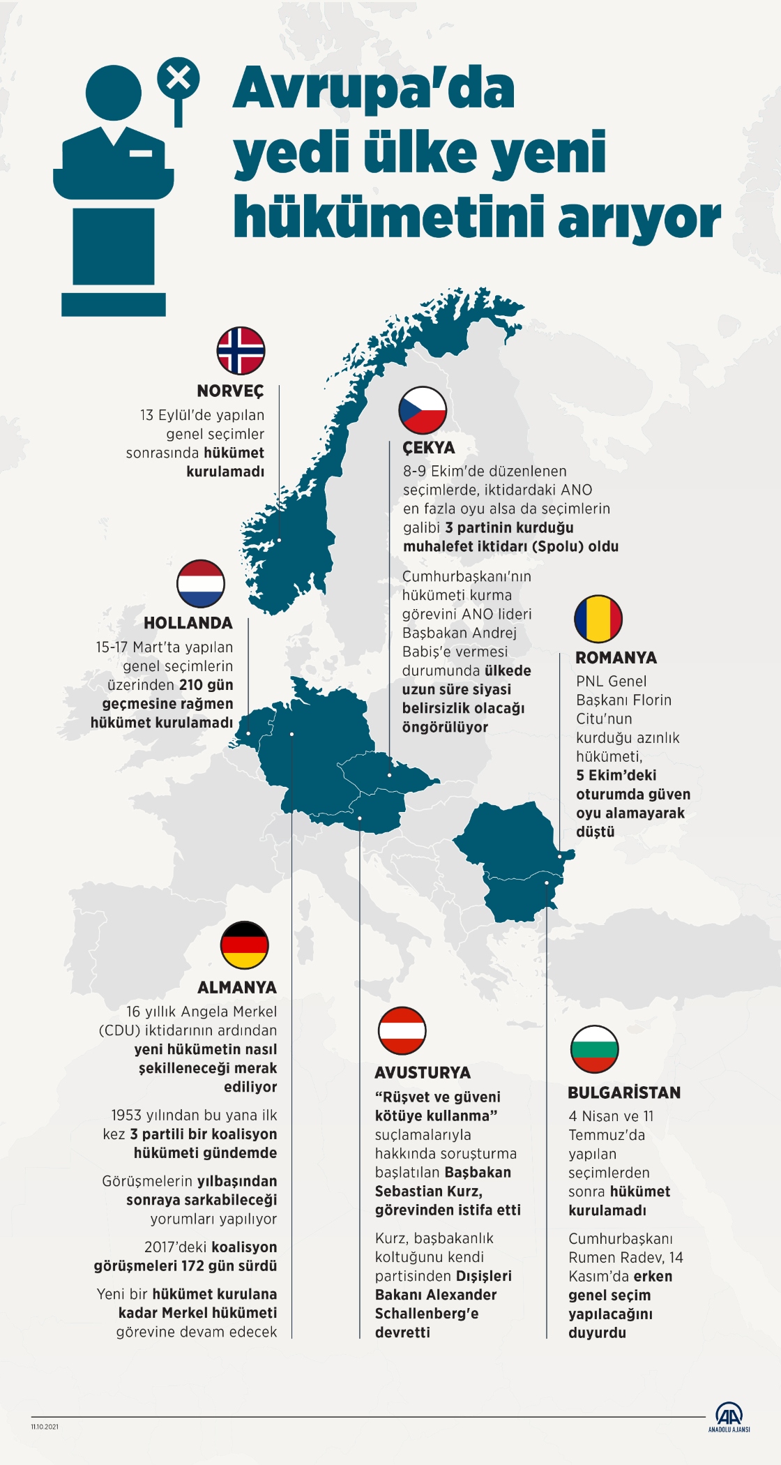 Avrupa'da toplam 7 ülke, seçim sonrası koalisyon görüşmeleri, güvenoyu alamama ya da başbakanın istifa etmesi nedeniyle yeni hükümetini arıyor.