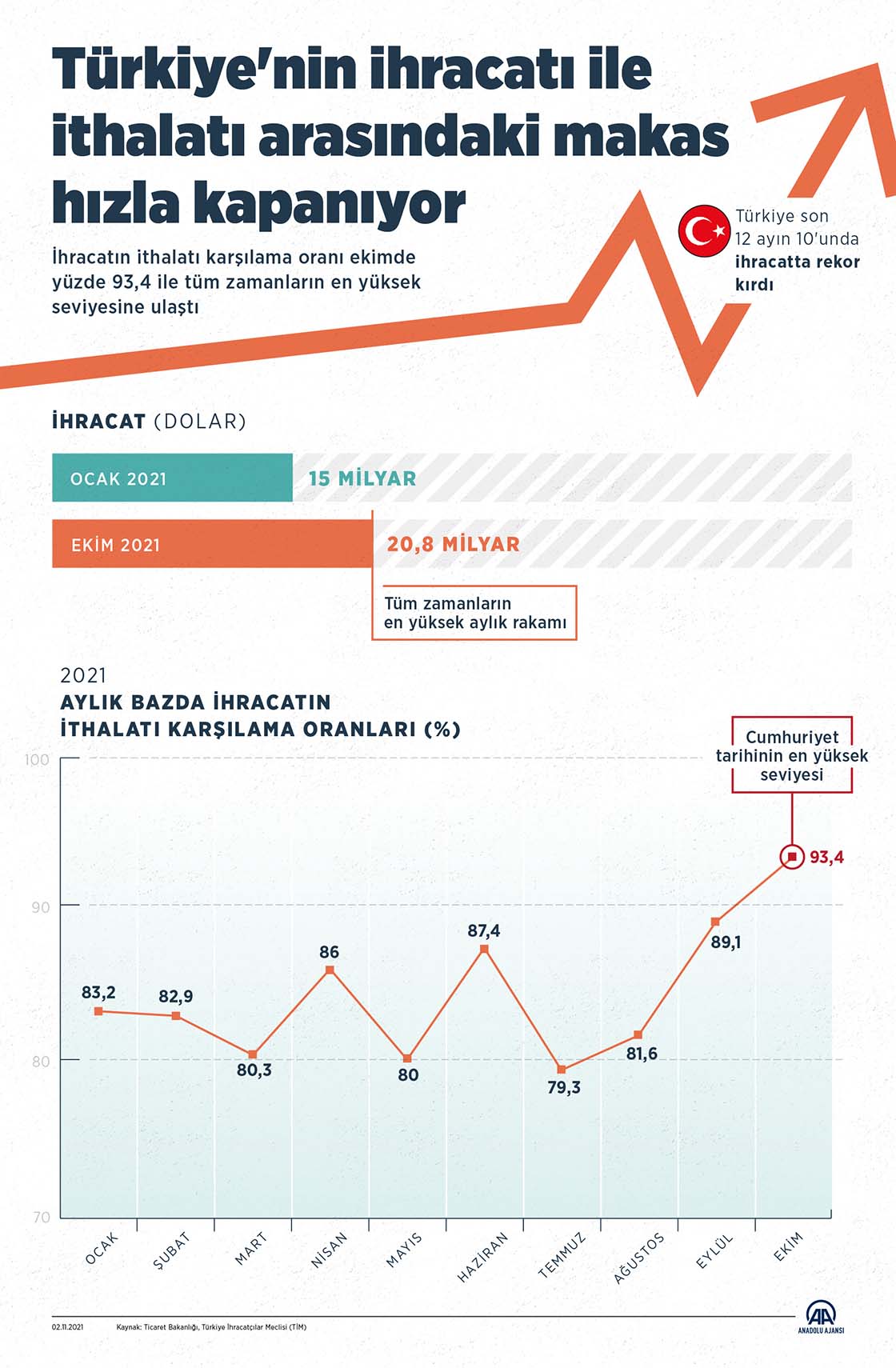 Türkiye, bu yıl ihracatta aylık ve yıllık bazda rekorlar kırarken, ihracatın ithalatı karşılama oranı da yüzde 93,4 ile cumhuriyet tarihinin en yüksek seviyesine çıktı. (Grafik: Yasin Demirci )