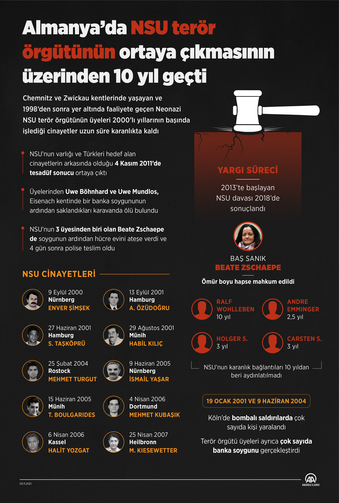 Almanya’da 2000-2007 yıllarında 8’i Türk, 10 kişinin öldürülmesinin arkasında aşırı sağcı Nasyonal Sosyalist Yeraltı (NSU) terör örgütünün olduğunun ortaya çıkmasının üzerinden 10 yıl geçti. (Grafik: Muhammed Ali Yiğit / AA)03 Kasım 2021•Güncelleme: 03 Kasım 2021