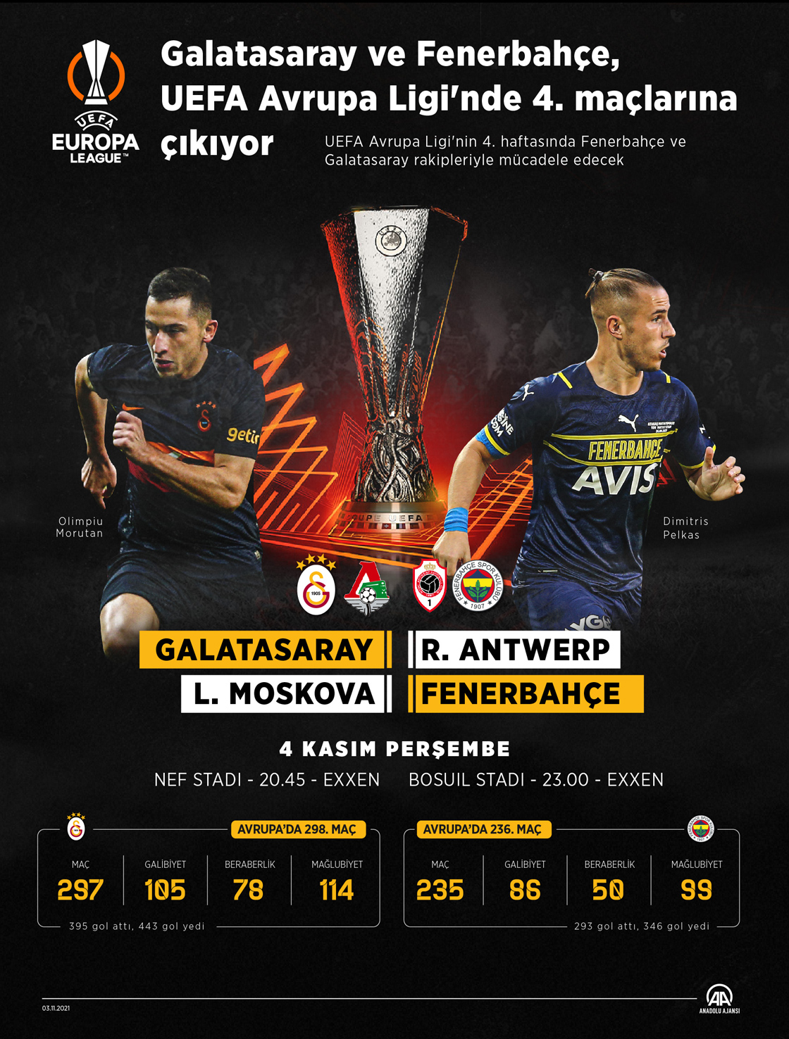 UEFA Avrupa Ligi'nin 4. haftasında Fenerbahçe ve Galatasaray rakipleriyle mücadele edecek. (Grafik: Kemal Delikmen / AA)