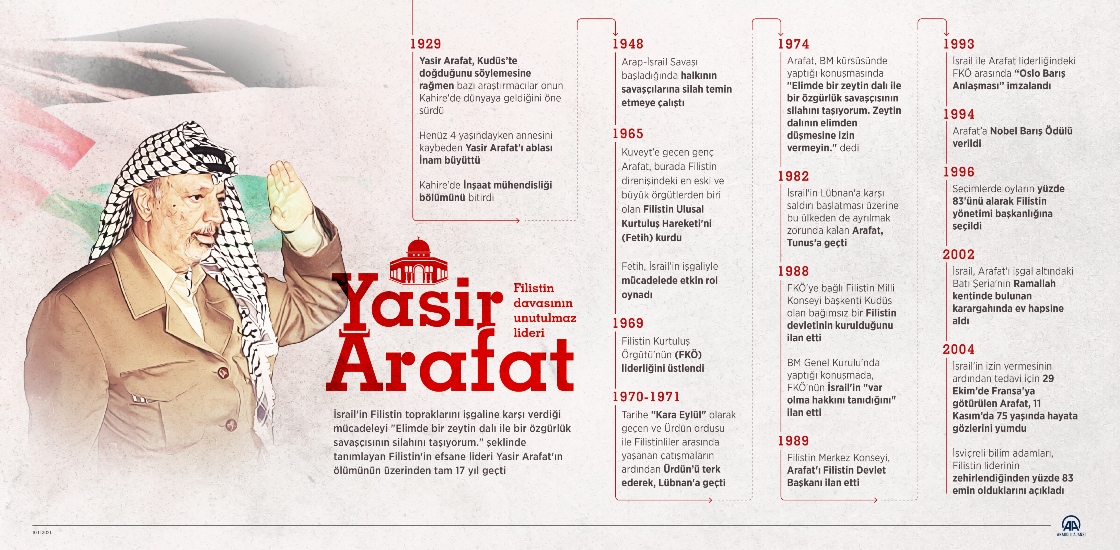 İsrail'in Filistin topraklarını işgaline karşı verdiği mücadeleyi "Elimde bir zeytin dalı ile bir özgürlük savaşçısının silahını taşıyorum." şeklinde tanımlayan Filistin'in efsane lideri Yasir Arafat'ın ölümünün üzerinden tam 17 yıl geçti.