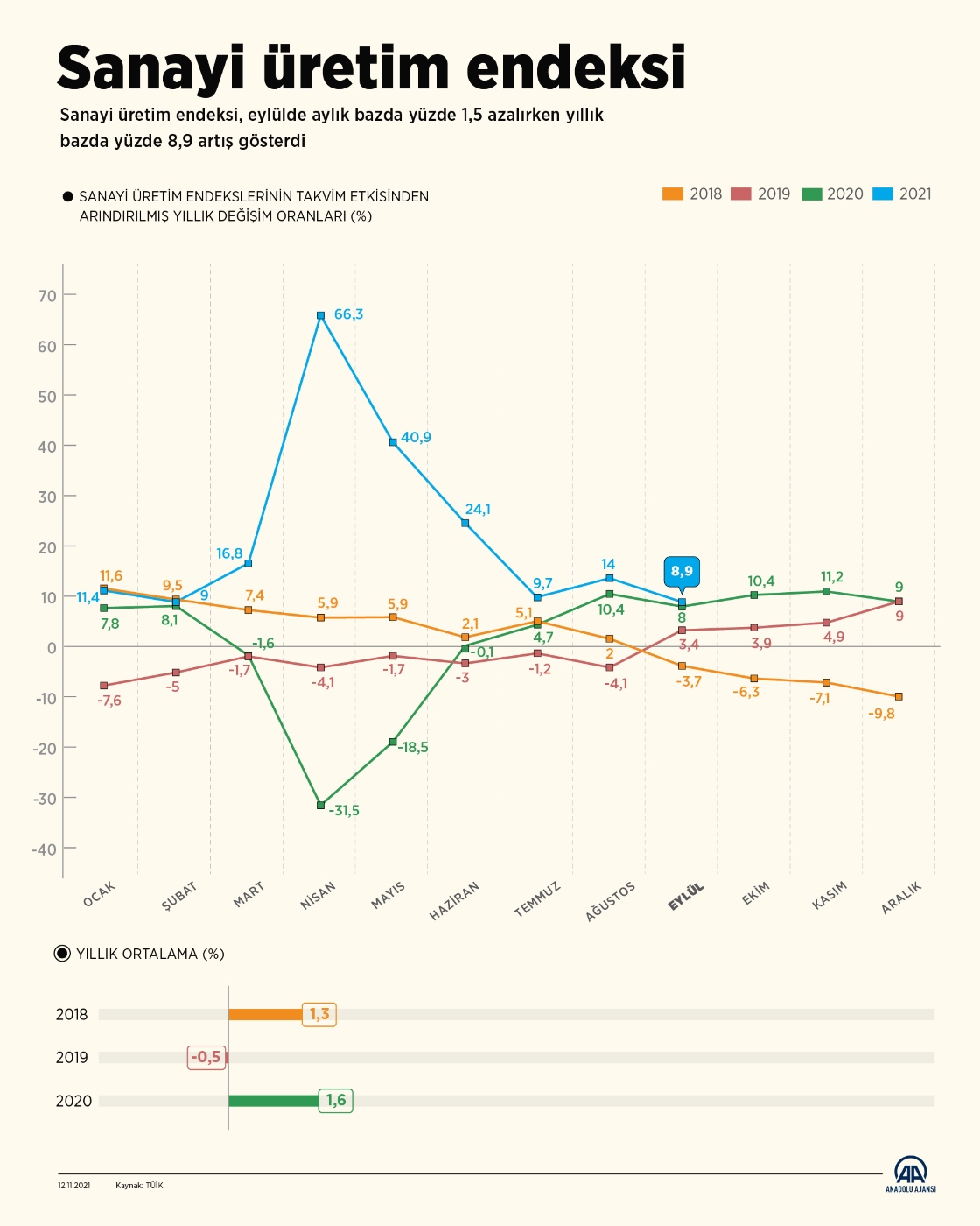 Sanayi üretim endeksi, eylülde aylık bazda yüzde 1,5 azalırken yıllık bazda yüzde 8,9 artış gösterdi.