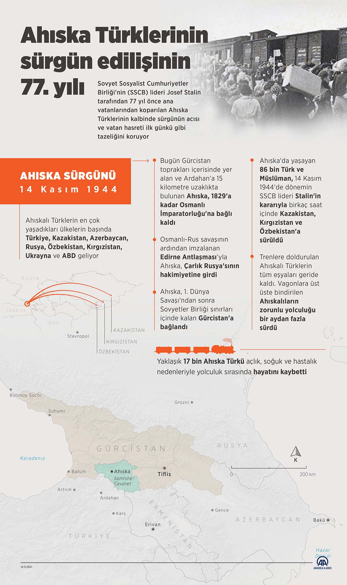 Sovyet Sosyalist Cumhuriyetler Birliği'nin (SSCB) lideri Josef Stalin tarafından 77 yıl önce ana vatanlarından koparılan Ahıska Türklerinin kalbinde sürgünün acısı ve vatan hasreti ilk günkü gibi tazeliğini koruyor. (Grafik: Muhammed Ali Yiğit)