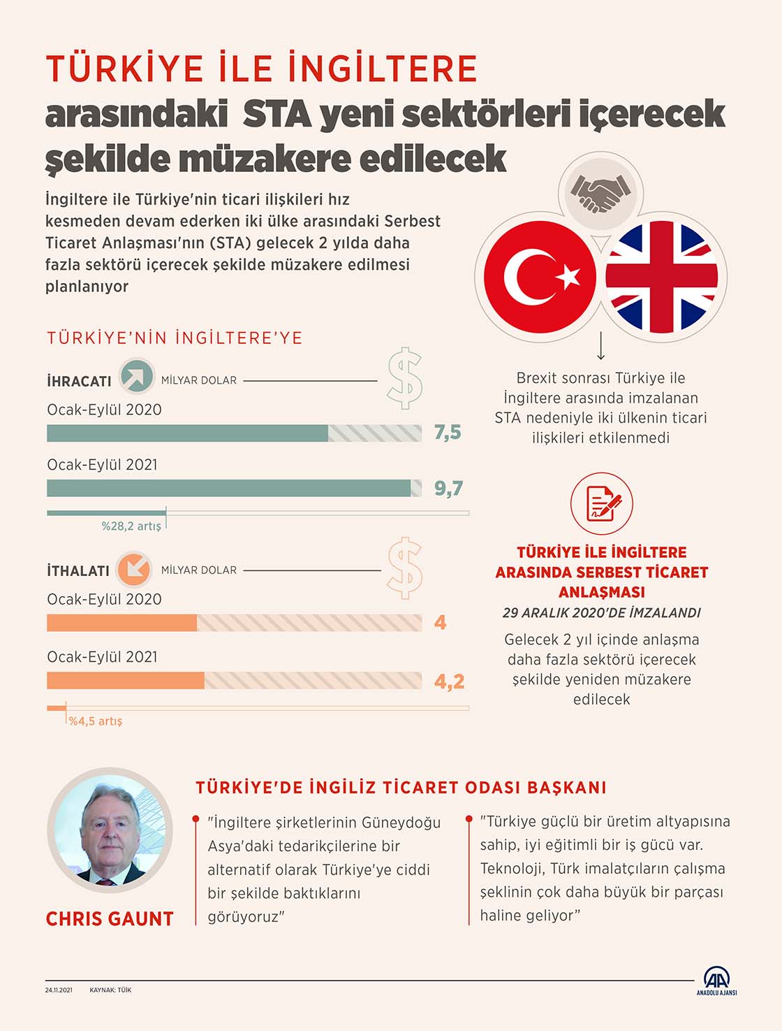 İngiltere ile Türkiye'nin ticari ilişkileri hız kesmeden devam ederken, iki ülke arasındaki Serbest Ticaret Anlaşması'nın (STA) gelecek 2 yılda daha fazla sektörü içerecek şekilde müzakere edilmesi planlanıyor. (Grafik: Muhammed Ali Yiğit / AA)24 Kasım 2021•Güncelleme: 24 Kasım 2021