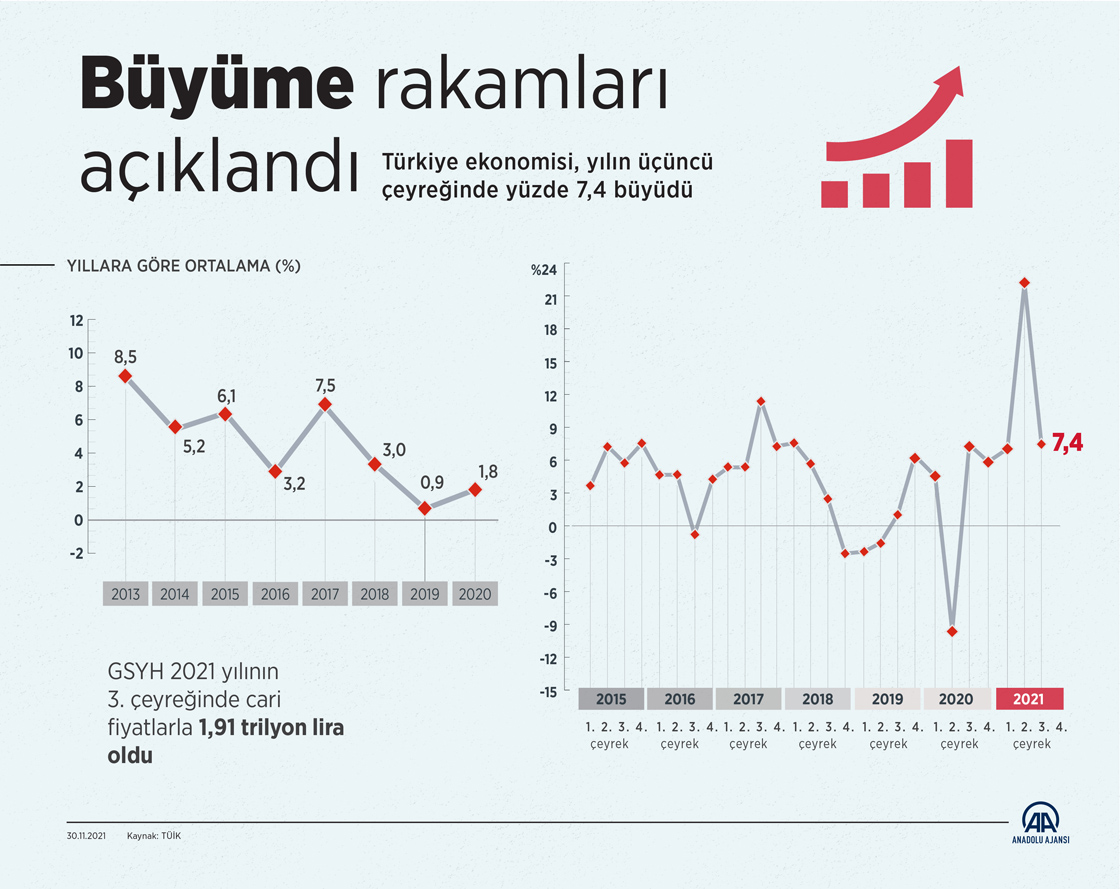 Türkiye ekonomisi yılın üçüncü çeyreğinde yüzde 7,4 büyüme kaydetti.(Grafik: Muhammed Ali Yiğit/AA)