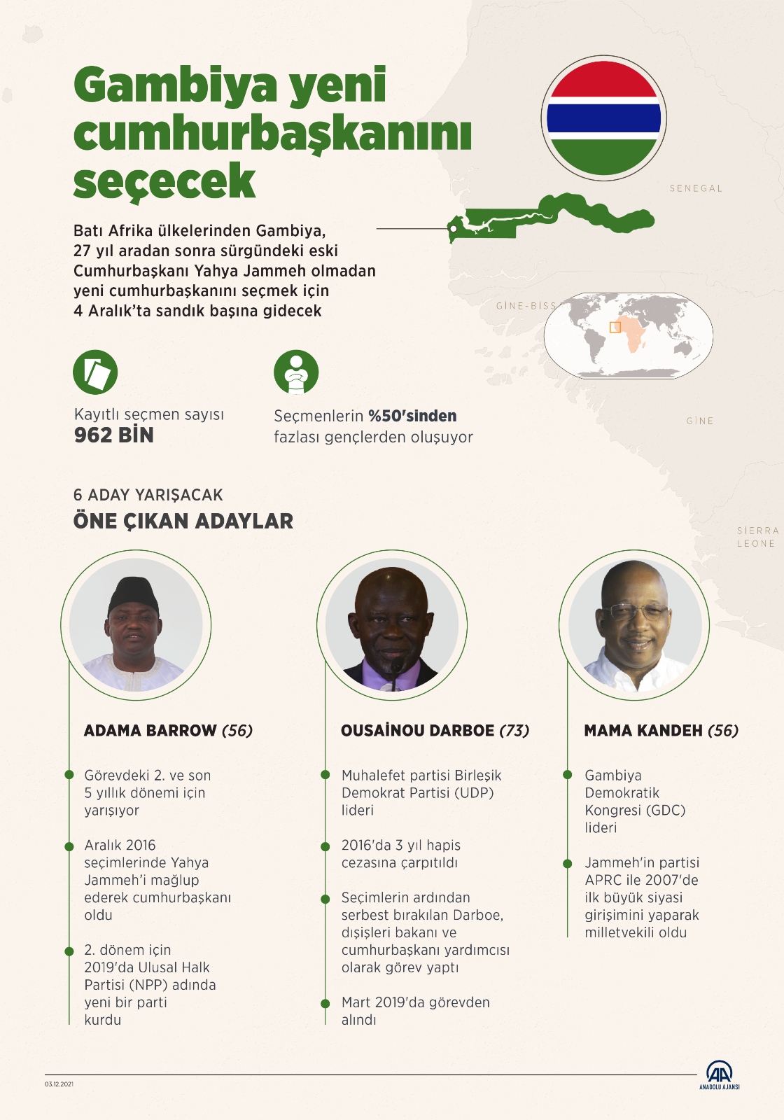 Batı Afrika ülkelerinden Gambiya, 27 yıl aradan sonra sürgündeki eski Cumhurbaşkanı Yahya Jammeh olmadan yeni cumhurbaşkanını seçmek için 4 Aralık’ta sandık başına gidecek.