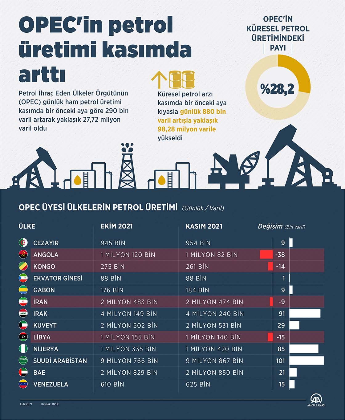 Petrol İhraç Eden Ülkeler Örgütünün (OPEC) günlük ham petrol üretimi kasımda bir önceki aya göre 290 bin varil artarak yaklaşık 27 milyon 720 bin varil oldu. (Grafik: Yasin Demirci / AA)