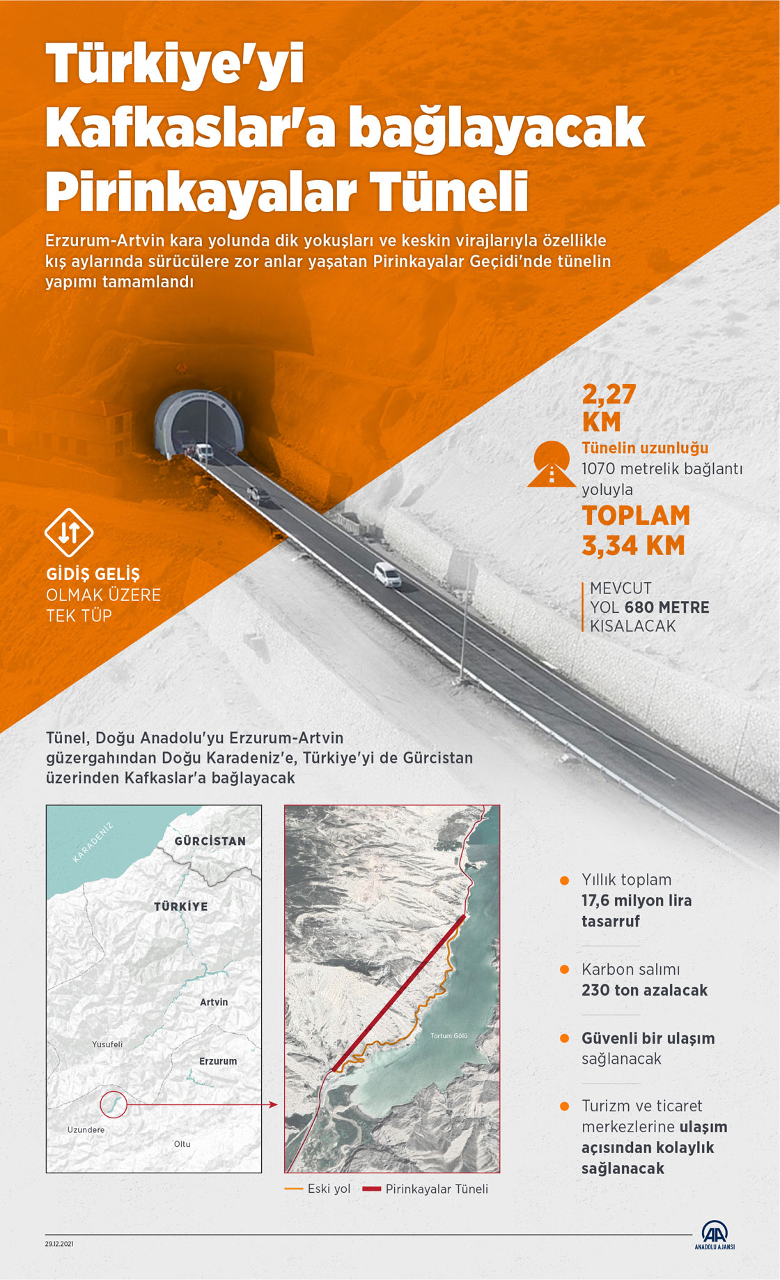 Erzurum-Artvin kara yolunda dik yokuşları ve keskin virajlarıyla özellikle kış aylarında sürücülere zor anlar yaşatan Pirinkayalar Geçidi'nde tünelin yapımı tamamlandı. (Grafik: Yasin Demirci / AA)