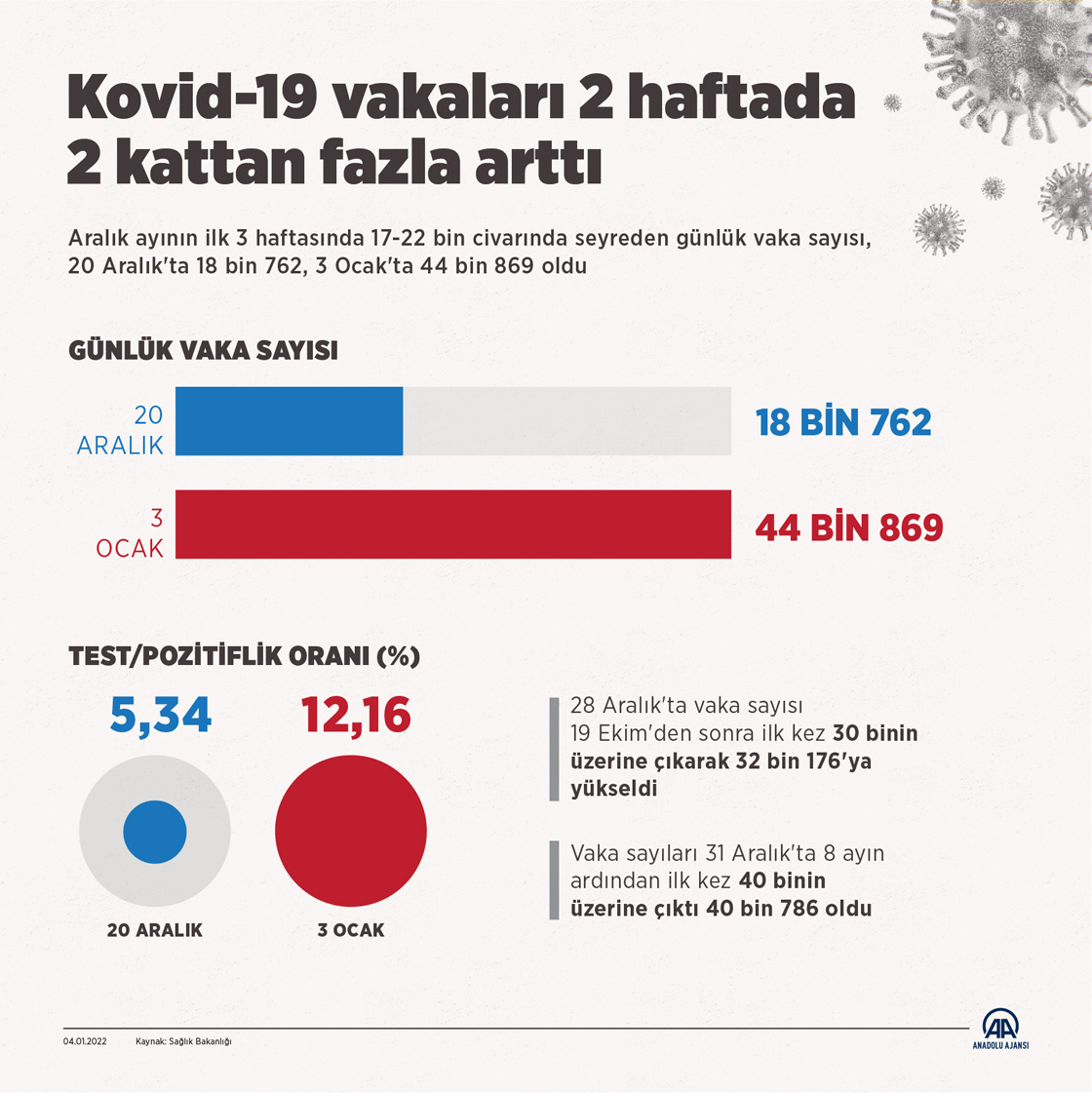 Aralık ayının ilk 3 haftasında 17-22 bin civarında seyreden günlük vaka sayısı, 20 Aralık'ta 18 bin 762, 3 Ocak'ta 44 bin 869 oldu.(Grafik: Omar Zaghloul/AA)