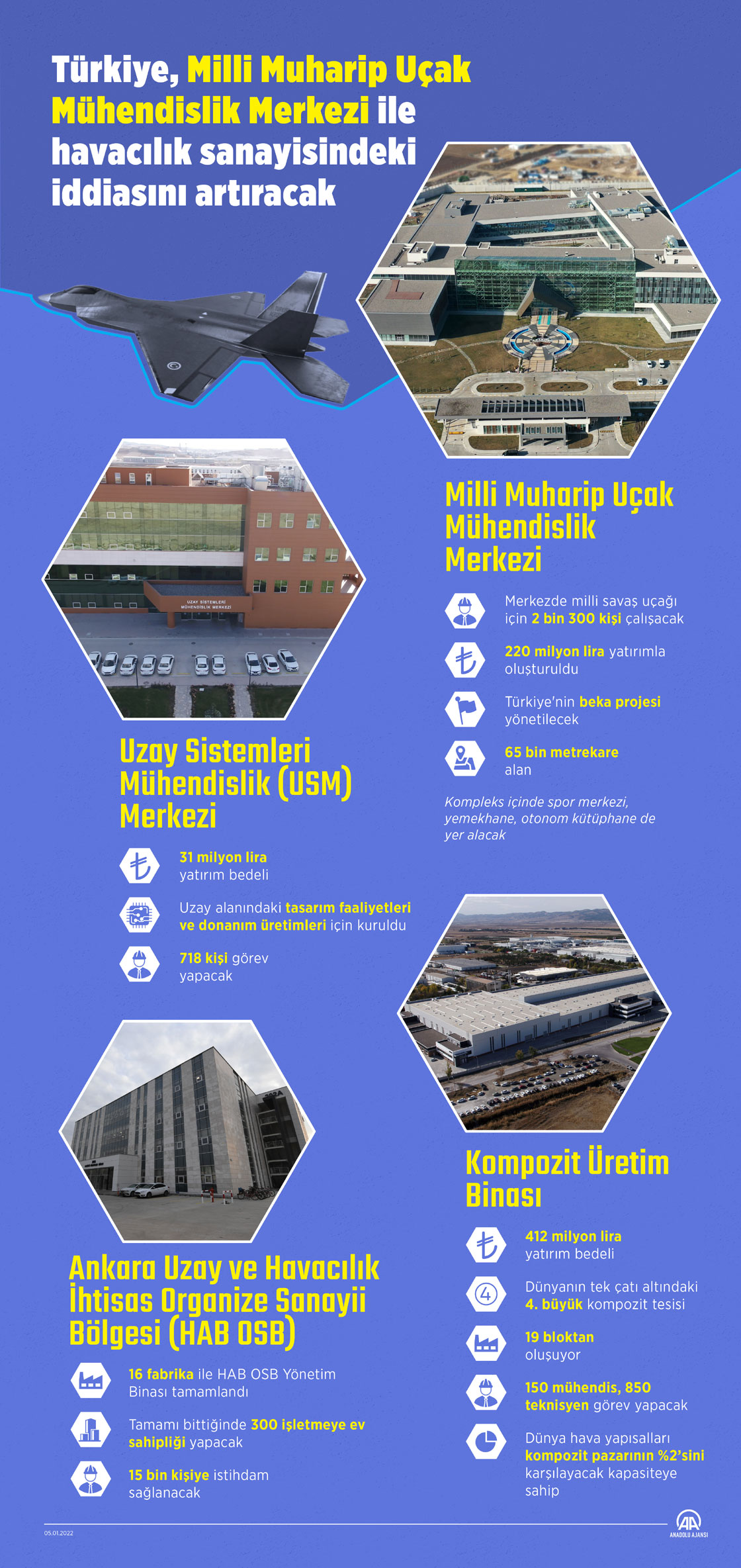 Cumhurbaşkanlığı Savunma Sanayii Başkanlığı koordinasyonunda yürütülen MMU Projesi'nin Mühendislik Merkezi'nin yanı sıra Türk Havacılık ve Uzay Sanayii AŞ'de (TUSAŞ) yapımı tamamlanan bir dizi tesis için yarın tören düzenlenecek. TUSAŞ’ta gerçekleştirilecek törene, Cumhurbaşkanı Recep Tayyip Erdoğan’ın da katılması bekleniyor. (Elmurod Usulabiev/AA)05 Ocak 2022•Güncelleme: 05 Ocak 2022