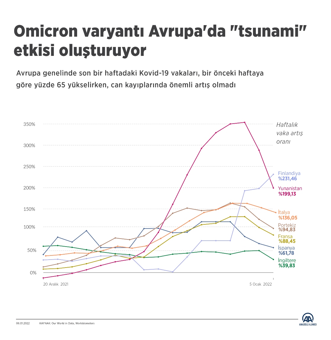 Avrupa genelinde son bir haftadaki Kovid-19 vakaları, bir önceki haftaya göre yüzde 65 yükselirken, can kayıplarında önemli artış olmadı.