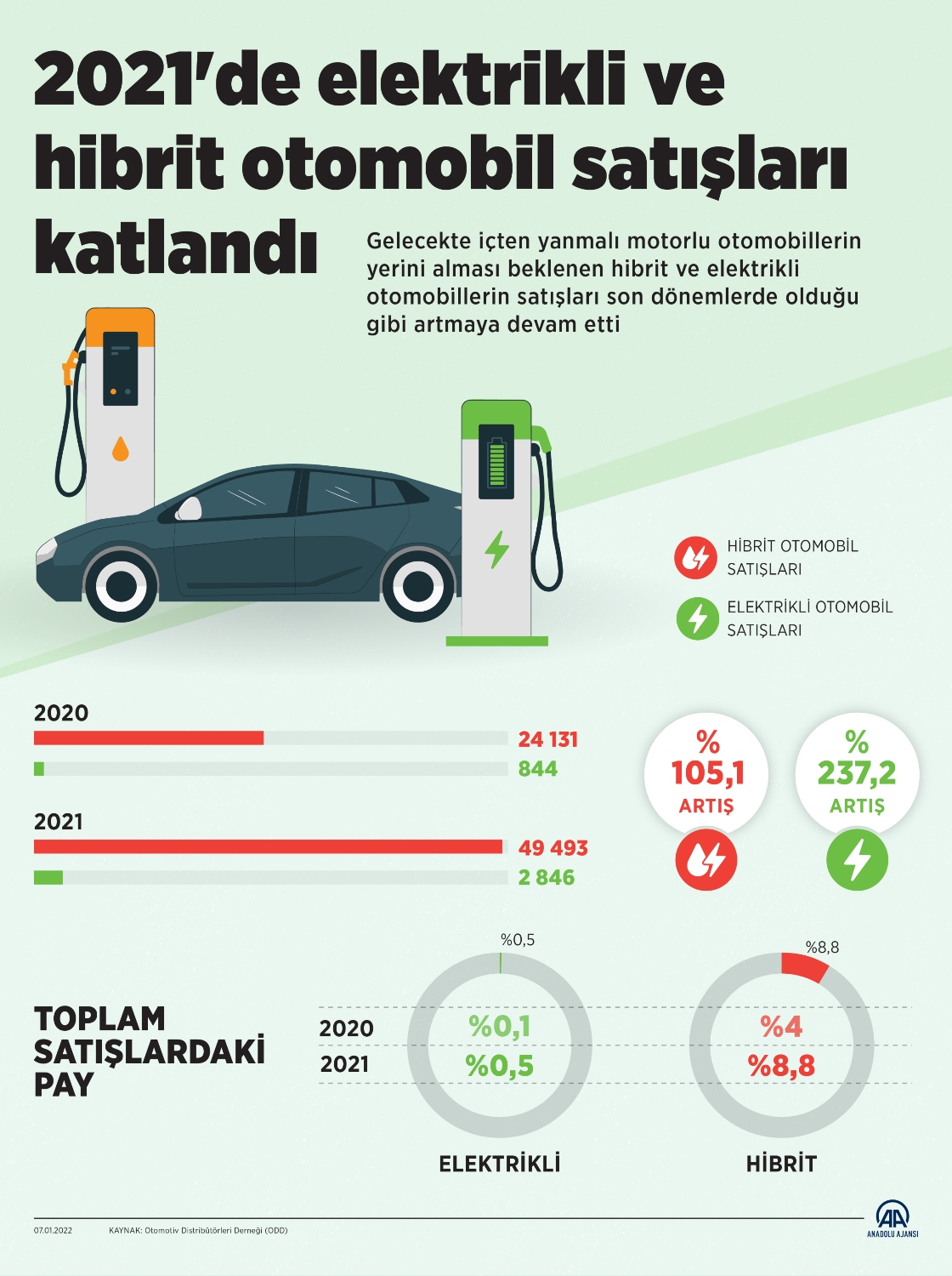 Türkiye'de geçen yıl elektrikli otomobil satışları bir önceki yıla kıyasla yüzde 237,2 artışla 2 bin 846'ya ve hibrit otomobil satışları da yüzde 105,1 artışla 49 bin 493'e yükselirken, hibrit motor tipi, satışlardan en fazla pay alan üçüncü motor tipi oldu.07 Ocak 2022•Güncelleme: 07 Ocak 2022