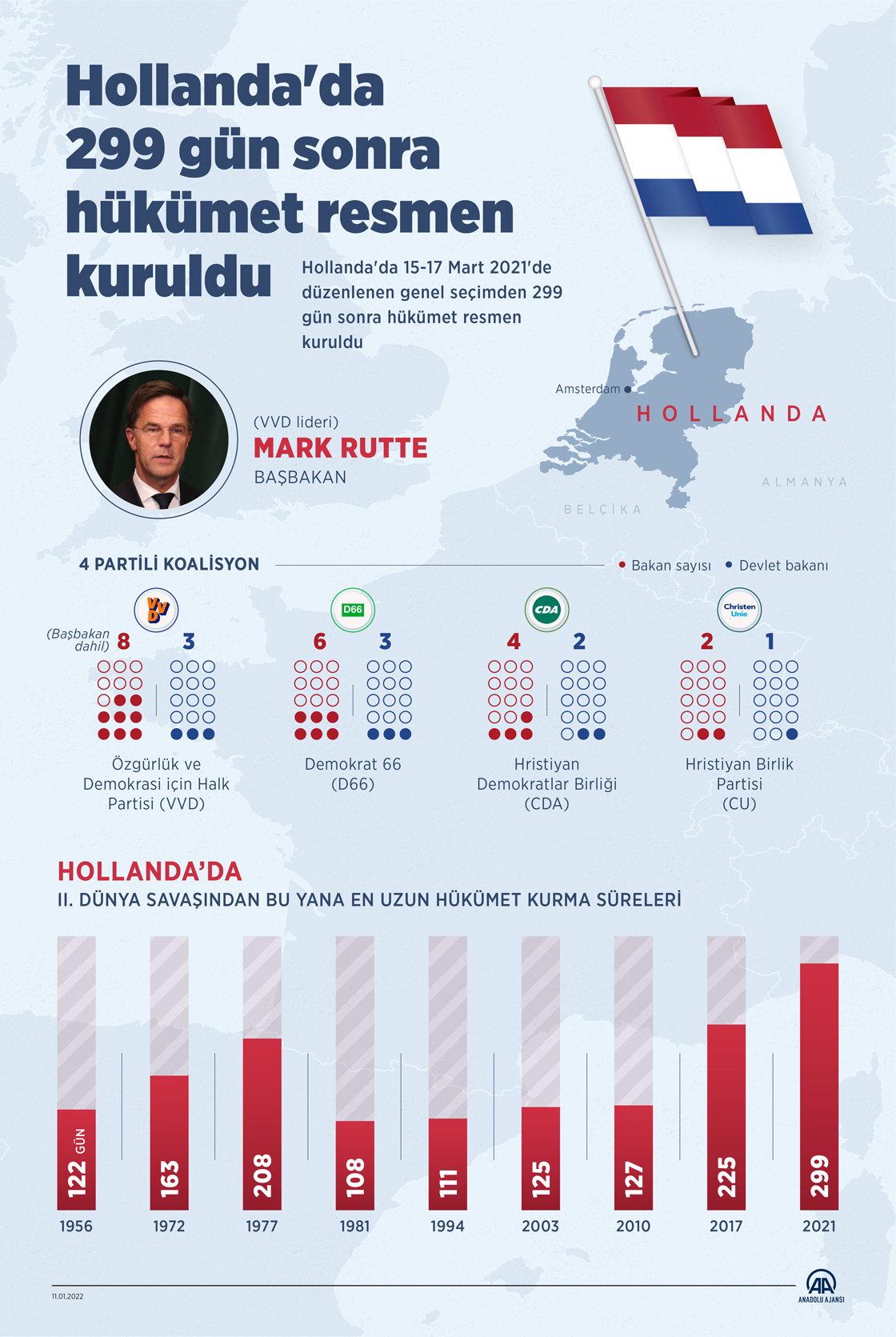 Hollanda'da 15-17 Mart 2021'de düzenlenen genel seçimden 299 gün sonra hükümet resmen kuruldu.(Grafik: Muhammed Ali Yiğit/AA)