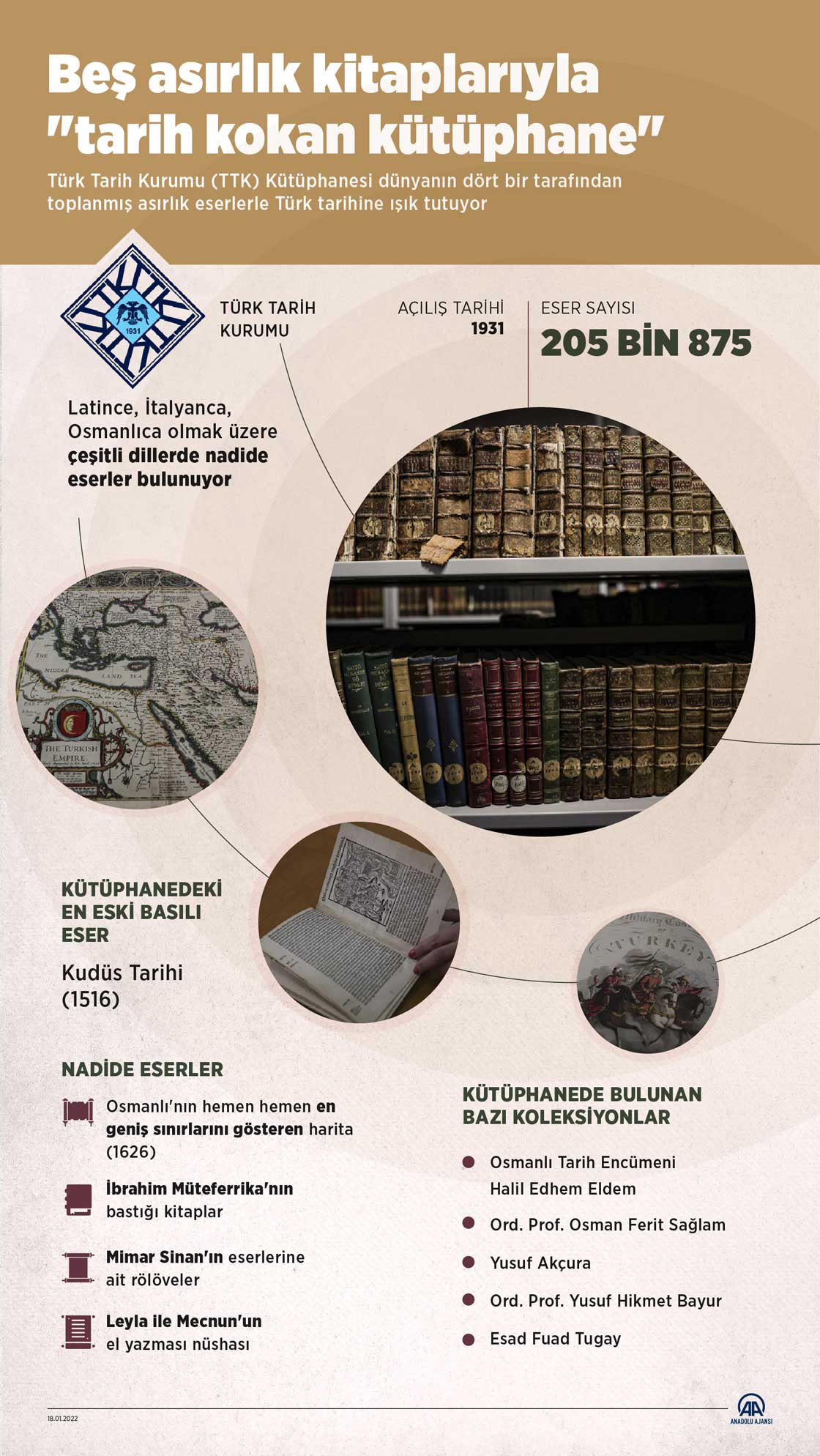 Türk Tarih Kurumu (TTK) Kütüphanesi dünyanın dört bir tarafından toplanmış asırlık eserlerle Türk tarihine ışık tutuyor. (Grafik: Mahmut Resul Karaca/AA)