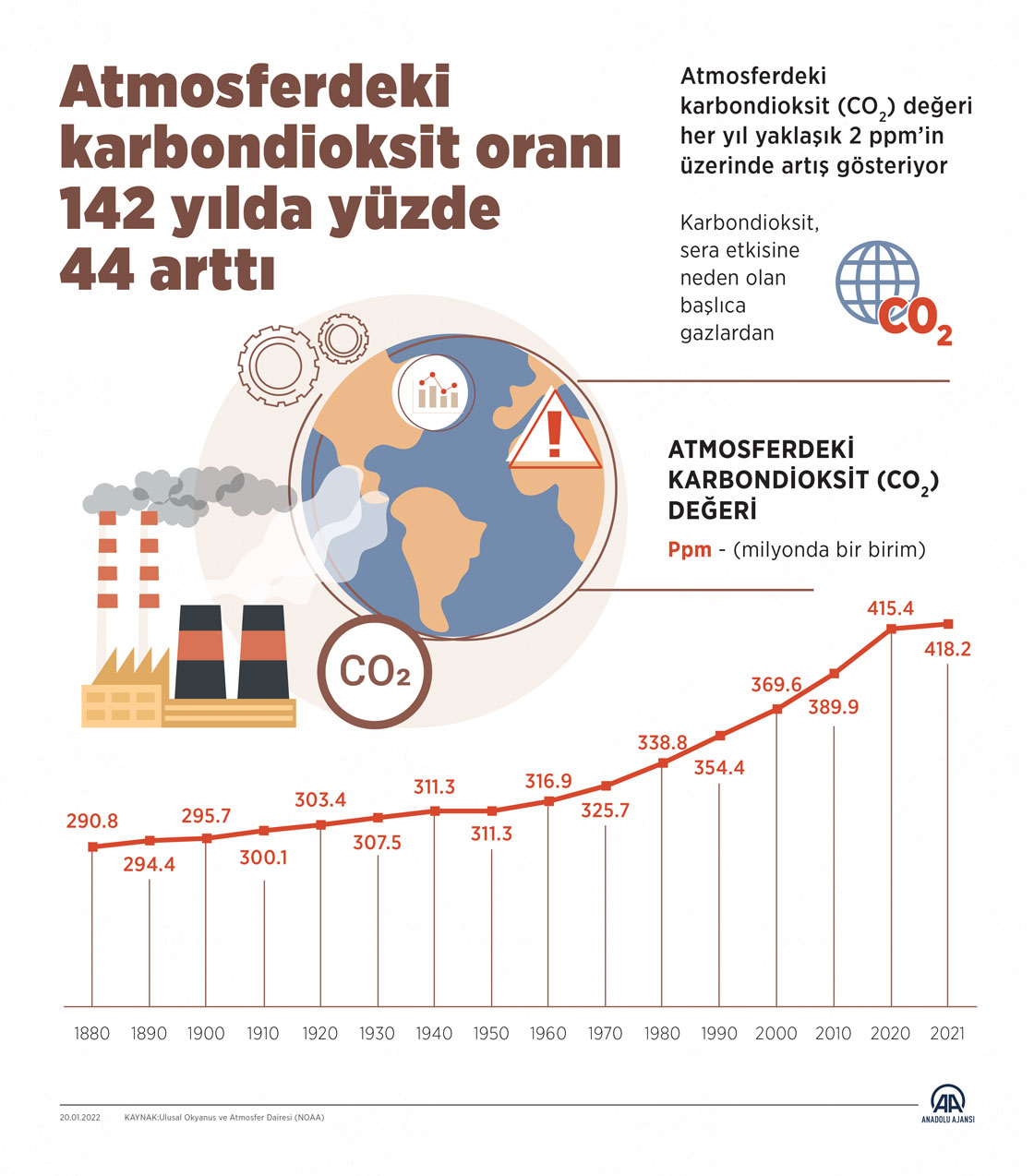Atmosferdeki karbondioksit oranı, 1880 yılından bugüne yüzde 44 artarak rekor seviyeye ulaştı. (Grafik: Elmurod Usubaliev / AA)