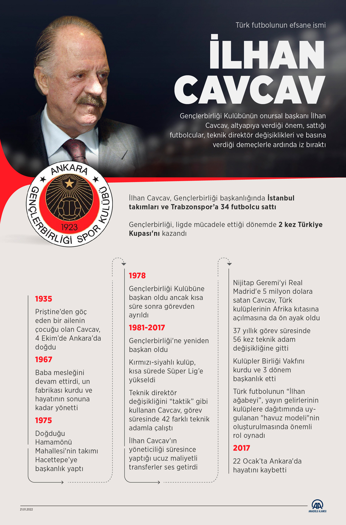 Gençlerbirliği Kulübünün onursal başkanı İlhan Cavcav, altyapıya verdiği önem, büyük takımlara sattığı futbolcular, teknik direktör değişiklikleri ve basına verdiği demeçlerle Türk futbolunda iz bıraktı. (Grafik: Omar Zaghloul / AA)