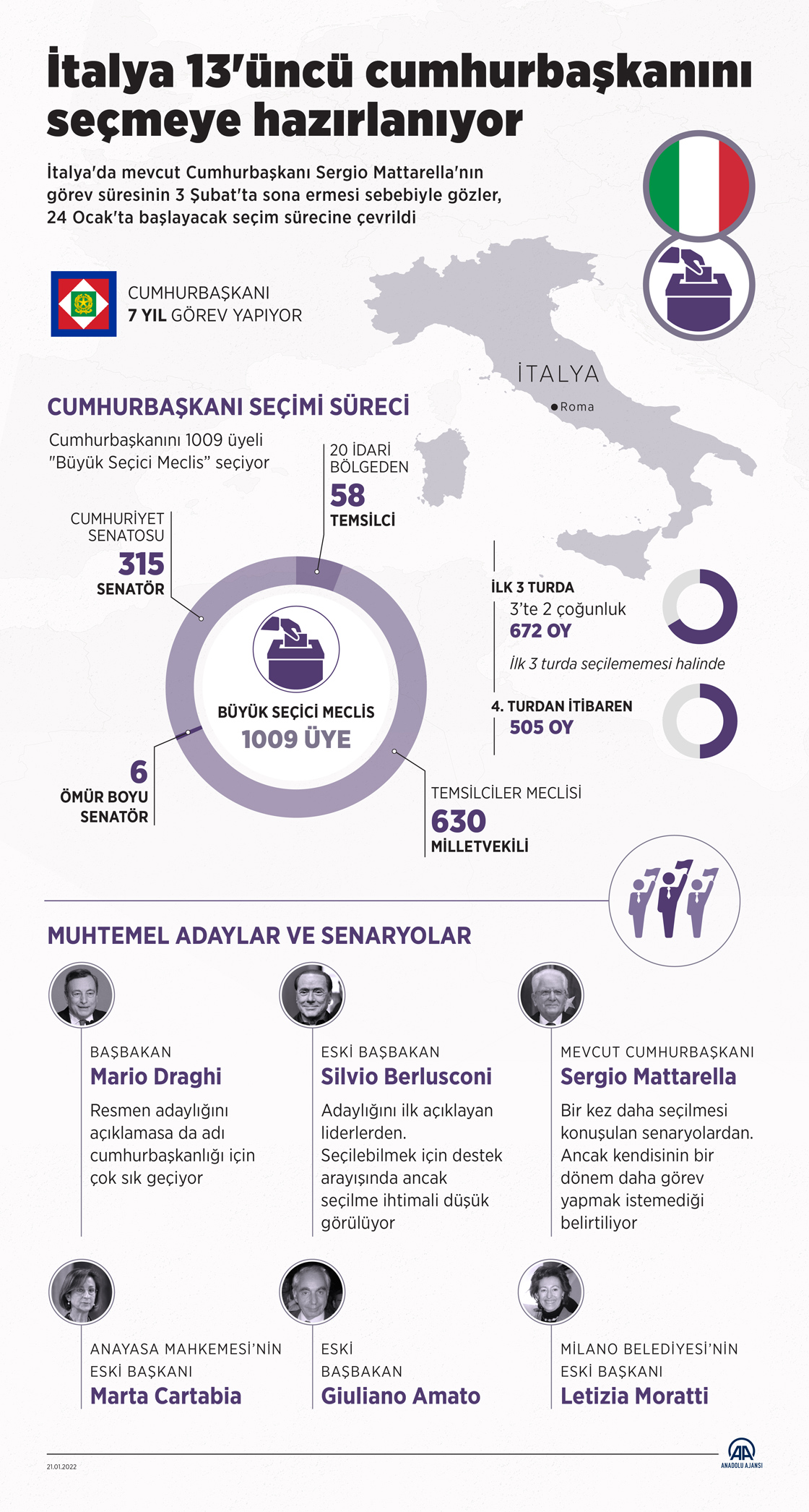 İtalya'da mevcut Cumhurbaşkanı Sergio Mattarella'nın görev süresinin 3 Şubat'ta sona ermesi sebebiyle gözler, 24 Ocak'ta başlayacak seçim sürecine çevrildi. (Grafik: Elmurod Usubaliev / AA)