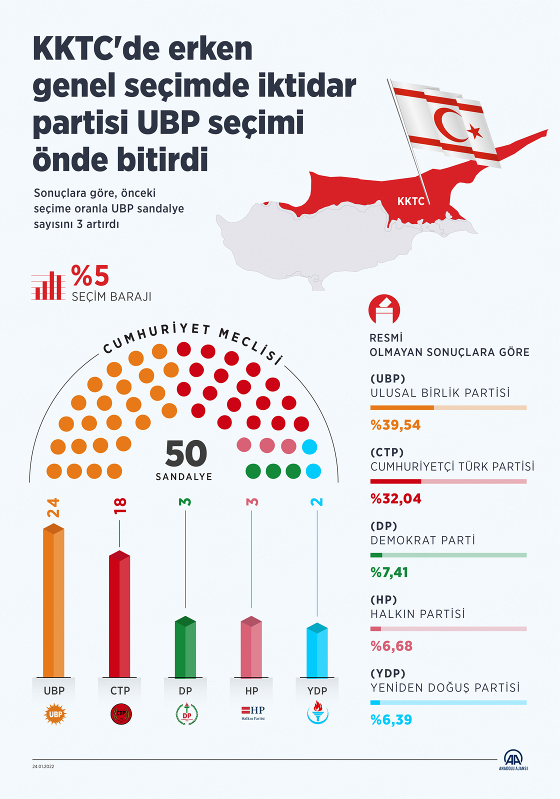 Kuzey Kıbrıs Türk Cumhuriyeti'nde (KKTC) Cumhuriyet Meclisi'nin 50 üyesini belirlemek amacıyla düzenlenen erken genel seçimde resmi olmayan sonuca göre Ulusal Birlik Partisi (UBP) yarışı önde bitirdi. (Grafik: Muhammed Ali Yiğit / AA)24 Ocak 2022•Güncelleme: 24 Ocak 2022